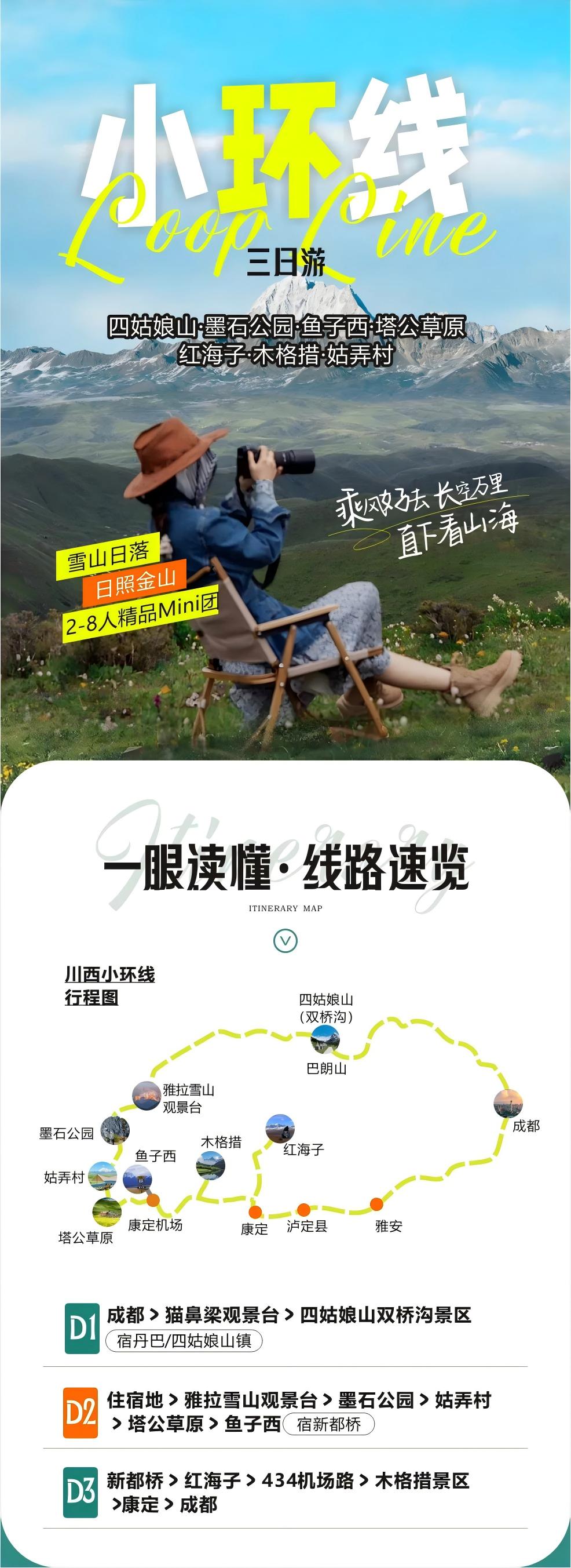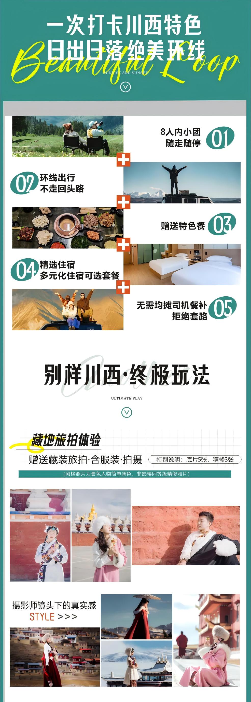 精品小團(tuán):隨走隨停,游覽時間自由;環(huán)線出行:打卡精華景點魚子西,四姑娘山,墨石公園,木格措,塔公草原,姑弄村,紅海子,康定機(jī)場路; 超值贈送:市區(qū)三環(huán)內(nèi)接早+旅游意外險+氧氣瓶+旅游三寶+隨車配備單反或無人機(jī)+特色美食+祈福體驗;
