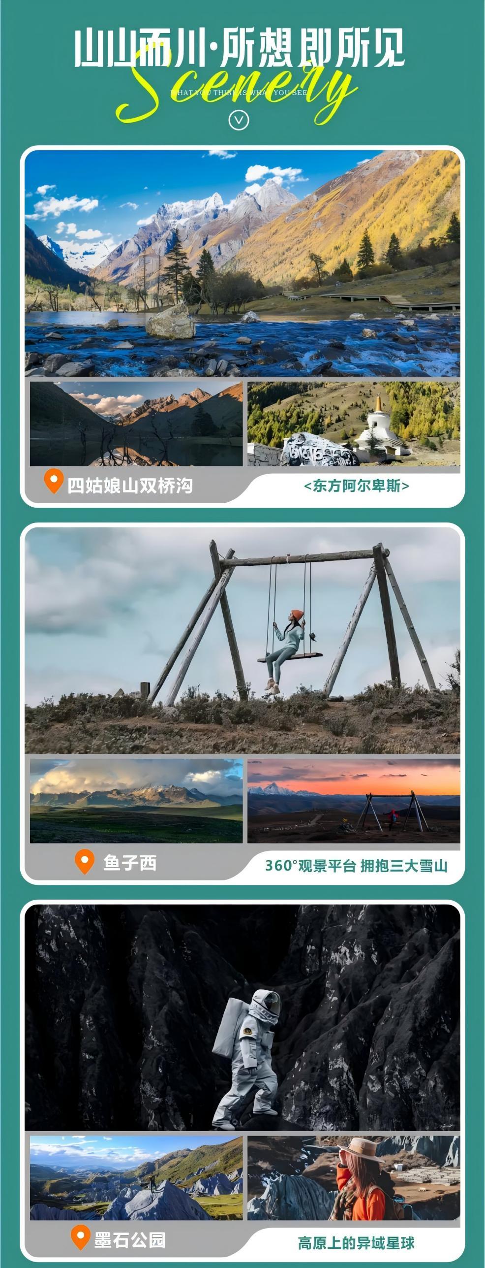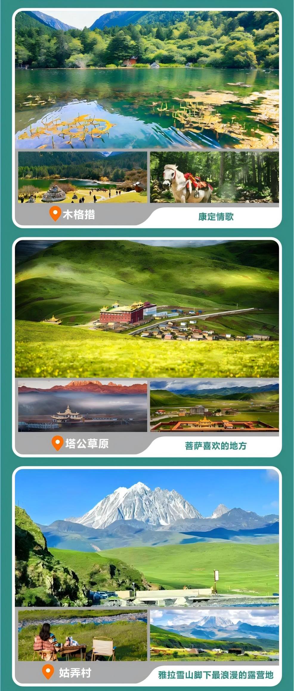 2、環(huán)線出行:打卡精華景點魚子西,四姑娘山,墨石公園,木格措,塔公草原,姑弄村,紅海子,康定機(jī)場路;