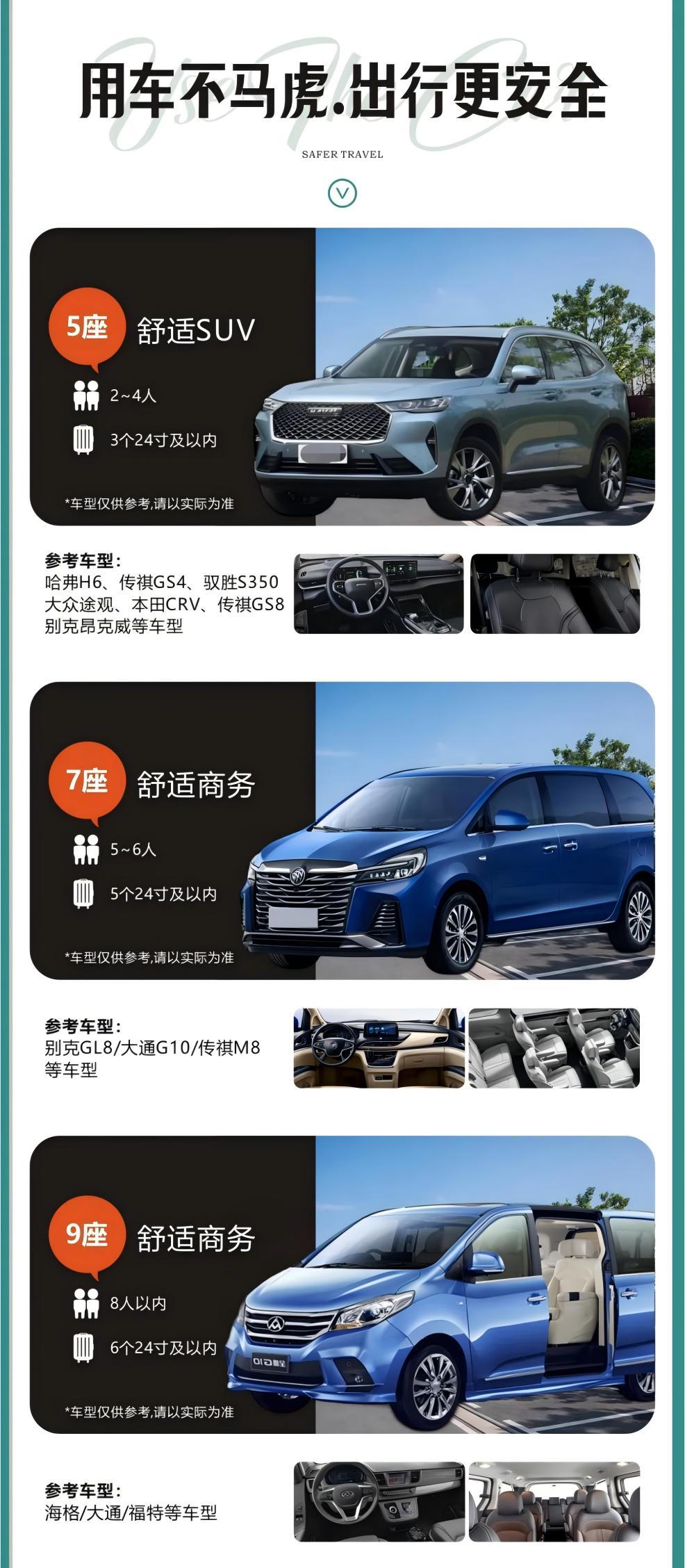 4、精選用車:全程出行5座SUV或舒適7座商務(wù)車或9座商務(wù)車,舒適出行,安全更保障;