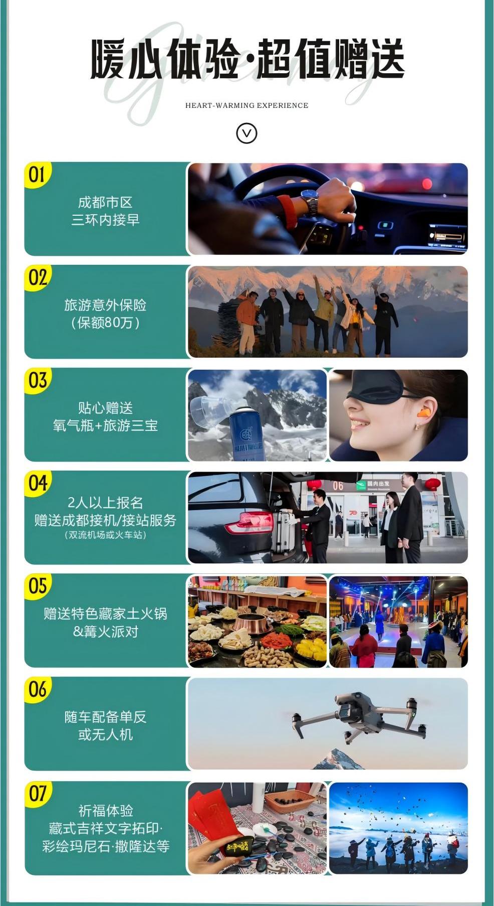3、超值贈送:市區(qū)三環(huán)內(nèi)接早+旅游意外險+氧氣瓶+旅游三寶+隨車配備單反或無人機(jī)+特色美食+祈福體驗;
