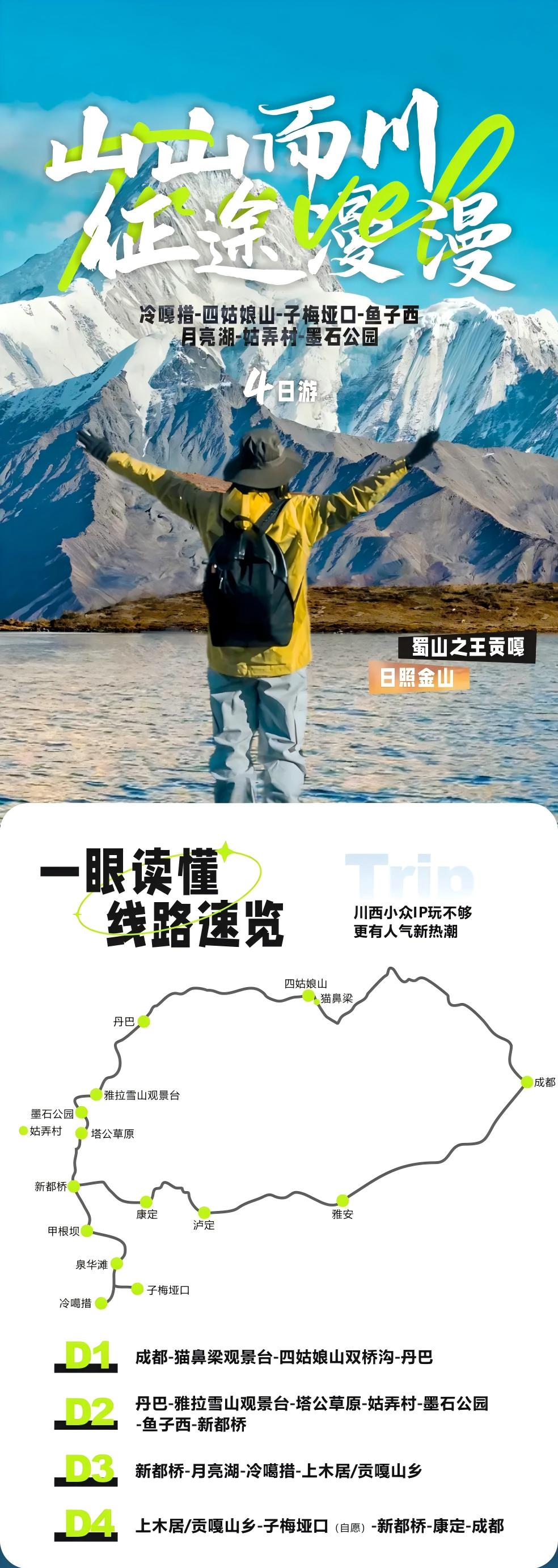 因丹巴縣泥石流斷道道路尚未恢復,現針對此情況暫定涉及四姑娘山景點的環線線路調整行程,綜合以上情況從7月17日出發起行程調整如下,后續恢復時間待定。