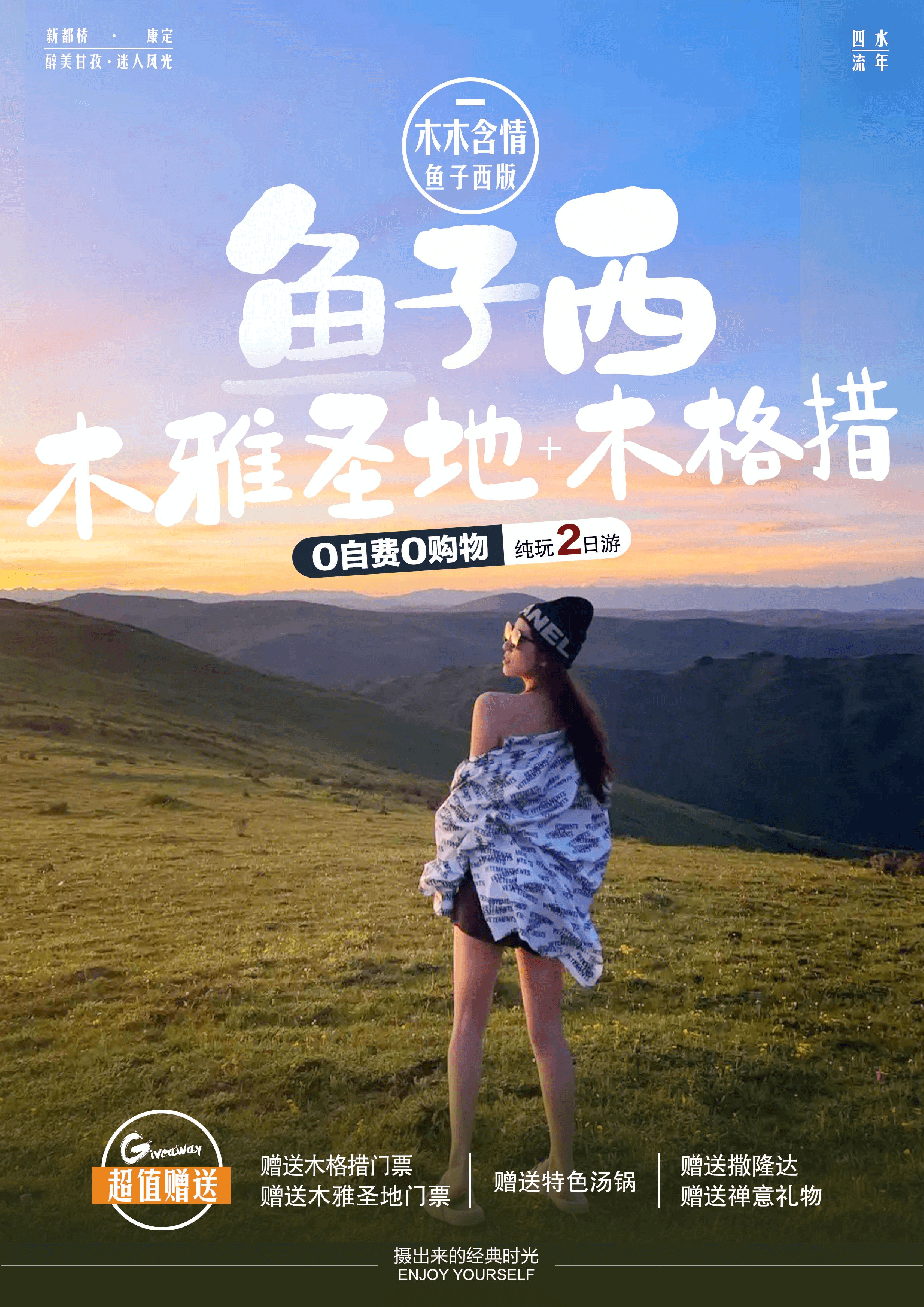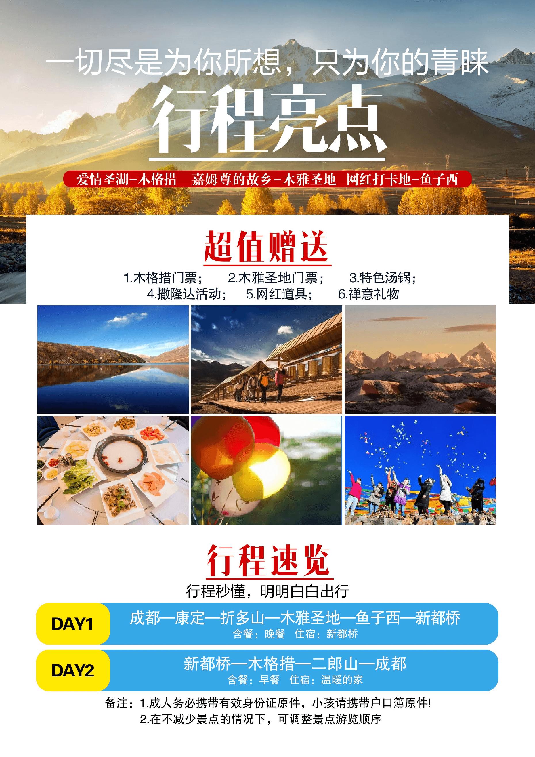 ★景點:木格措、木雅圣地、魚子西(木格措、木雅圣地為旅行社打包價,如因人力不可抗拒原因不能游覽或游客自愿放棄、及一切優惠、免票證件無退費)。