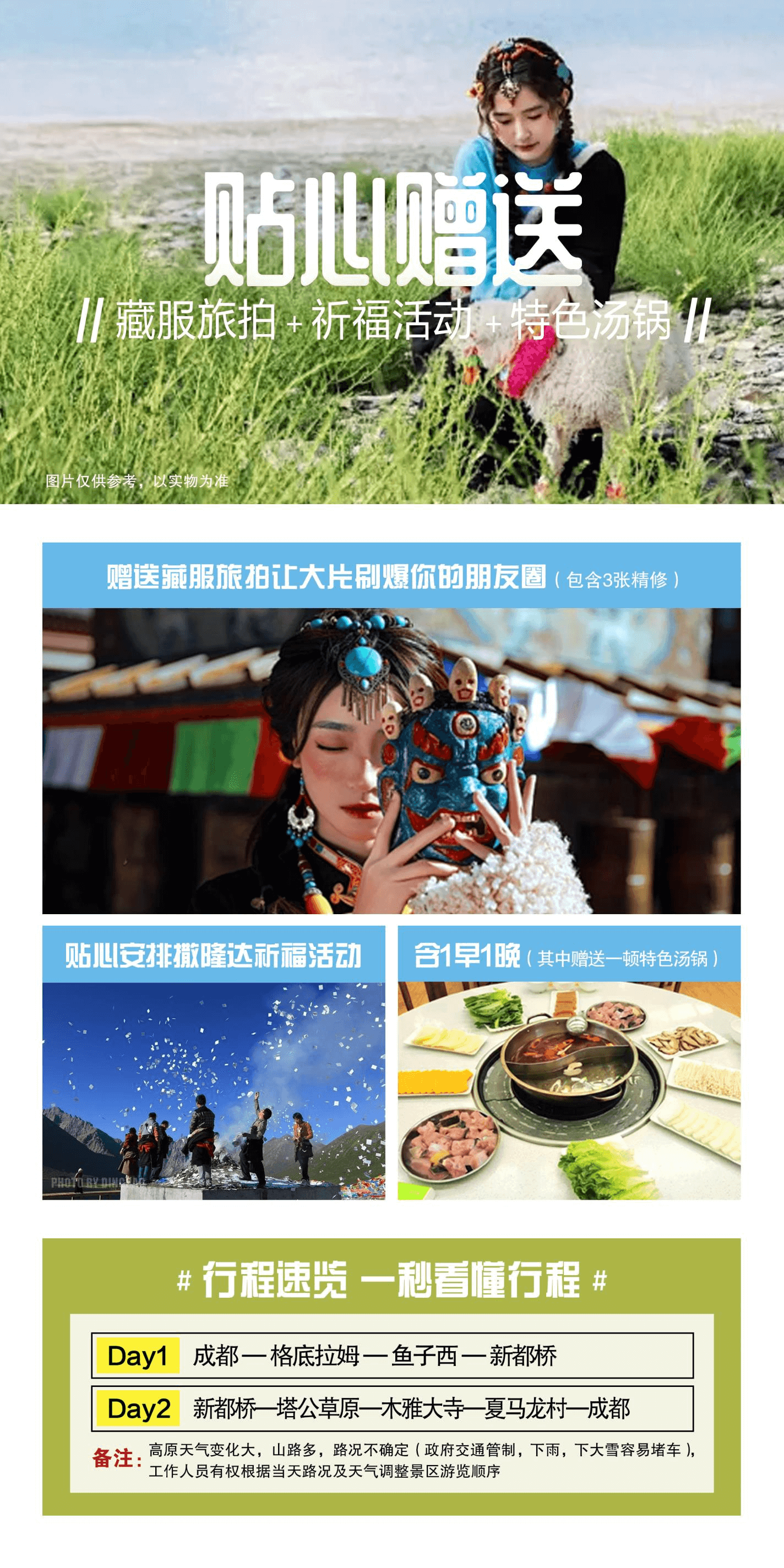 超值贈送:贈送特色湯鍋,撒隆達祈福活動,藏服旅拍(3張精修照片); 超絕美景:打卡格底拉姆,魚子西,塔公草原,夏馬龍村等絕美景點;