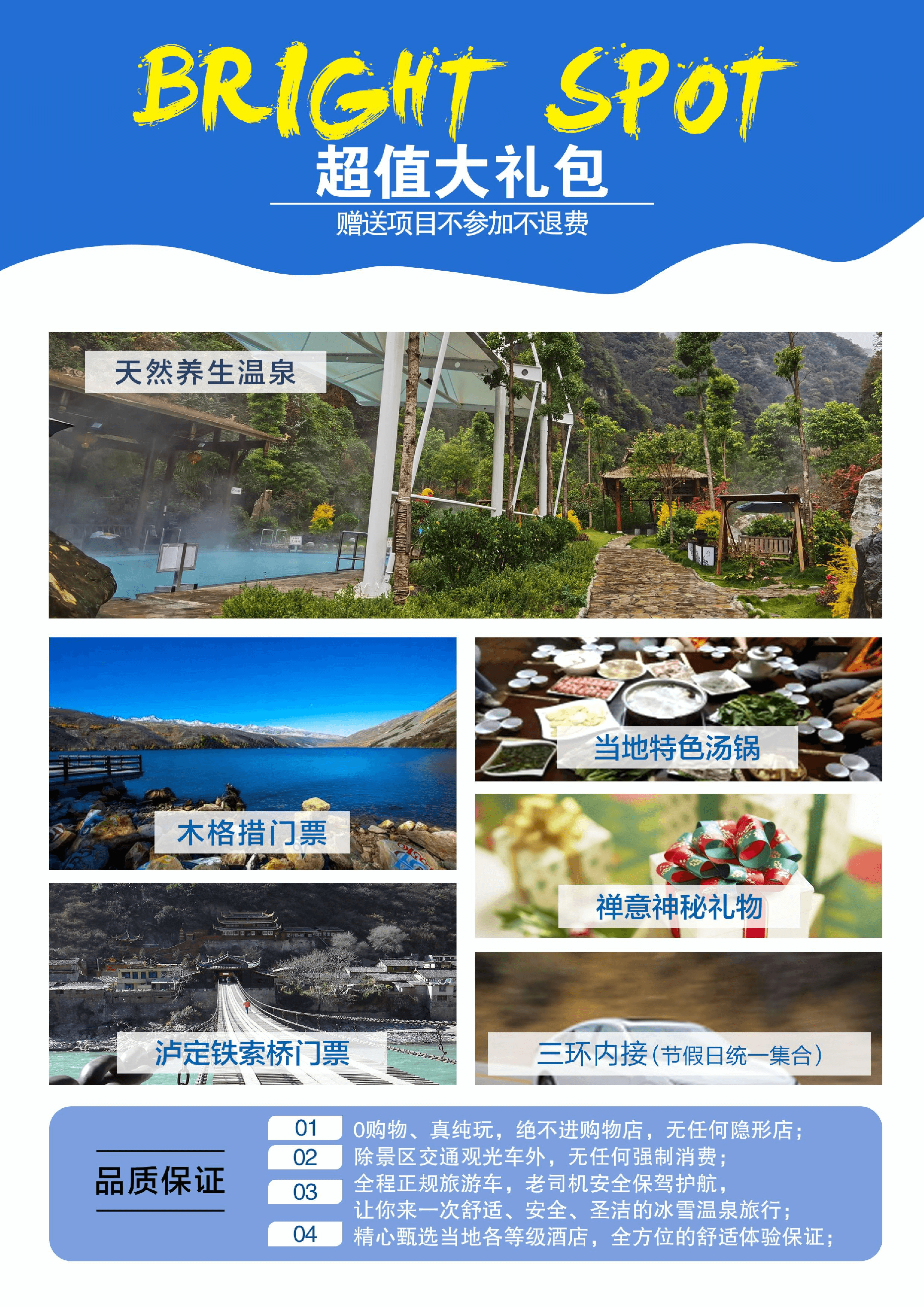 2、超值贈(zèng)送:贈(zèng)送天然養(yǎng)生溫泉、特色湯鍋、瀘定橋門票、木格措門票、三環(huán)內(nèi)接早服務(wù),神秘禮物等;