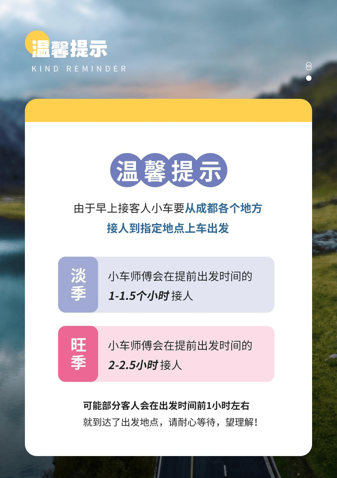 1、該行程成都市三環(huán)內包接,接人師傅會在出發(fā)前一天晚上 18:00-21:00 與您聯系,請您保持電話暢通。若 21 點仍未收到通知請及時給旅行社聯系。