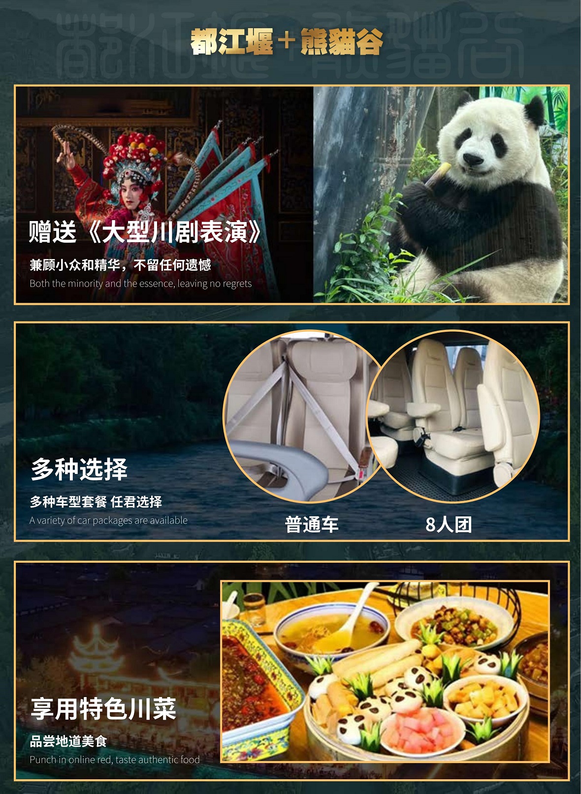 品質(zhì)純玩:真純玩、0購物、0自費(fèi); 精選景點(diǎn):漫游都江堰,嬉戲大熊貓;定制美食:午餐精選都江堰網(wǎng)紅餐廳--思源印象,品四大菜系--川椒蜀味, 享岷江之上--水上餐廳;