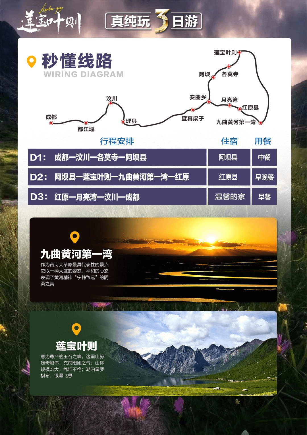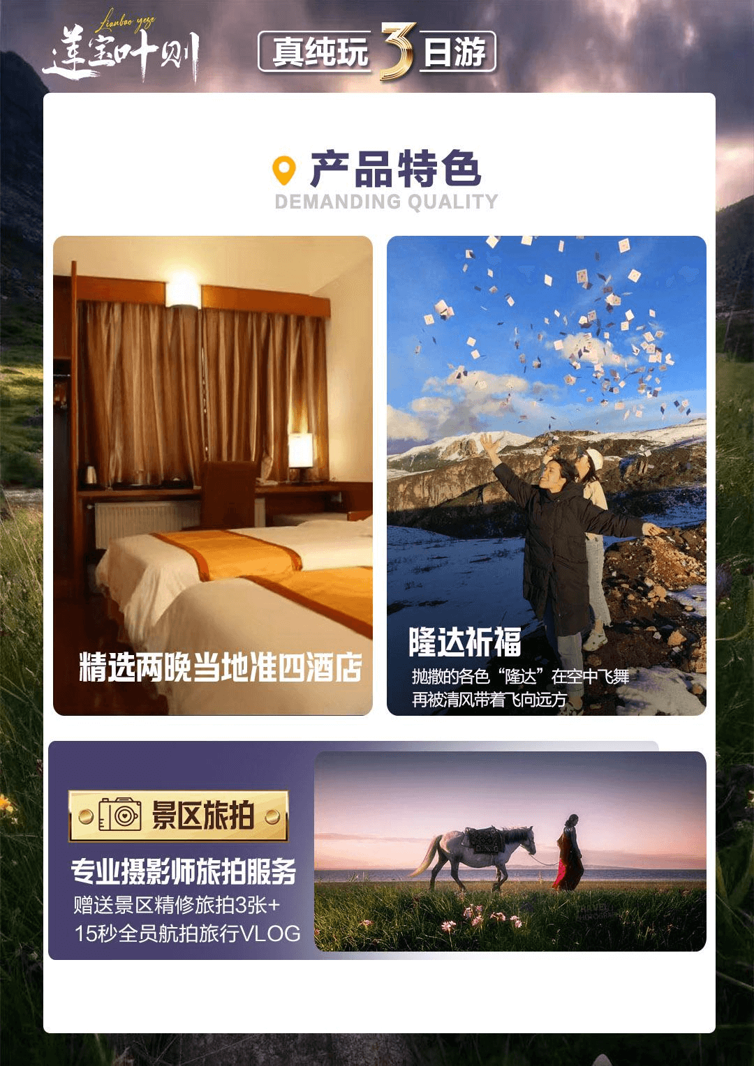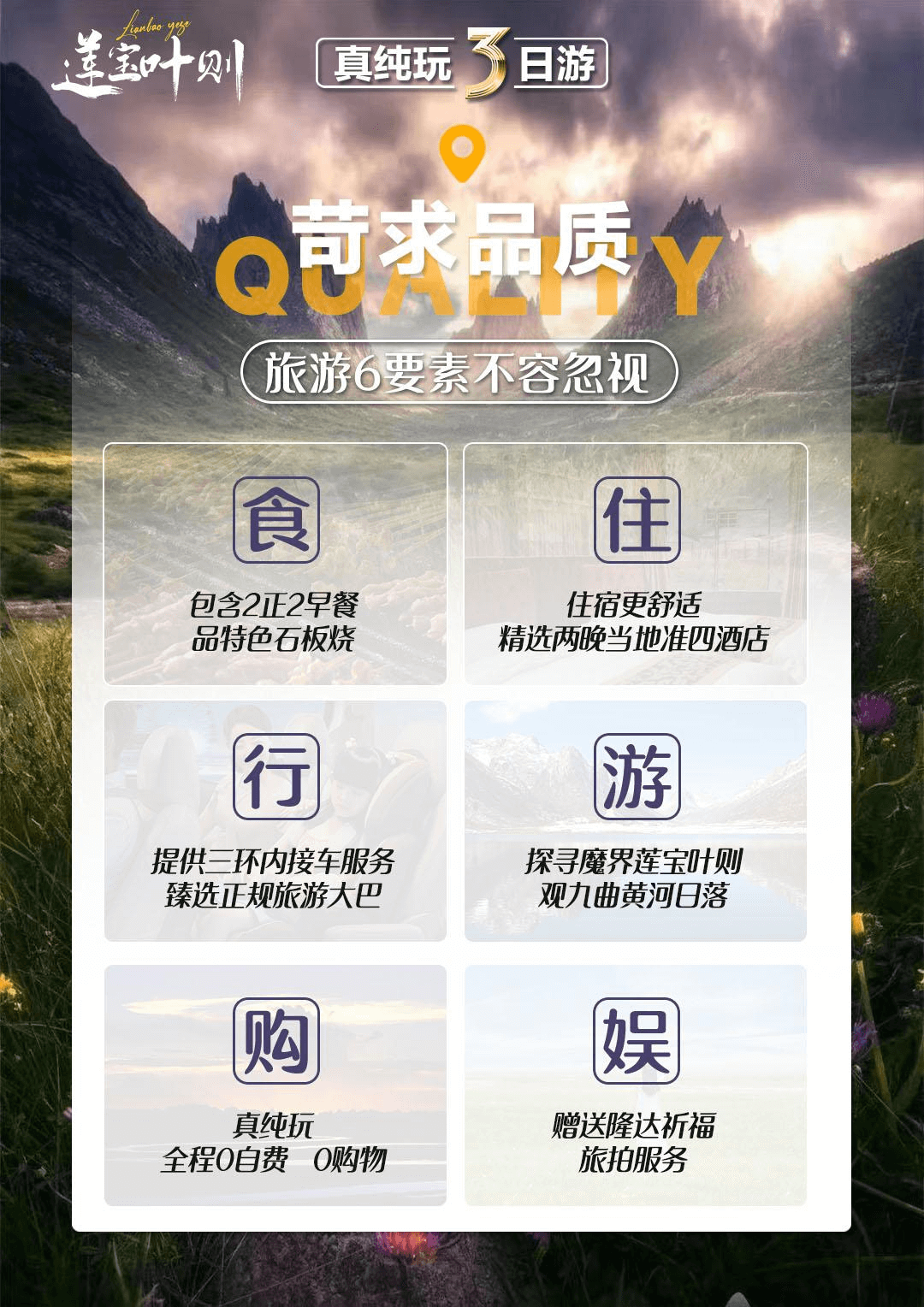 精選景點:游玩九曲黃河第一灣、蓮寶葉則、月亮灣等絕美景點;舒適住宿:精選兩晚當地準四酒店;品質純玩:不進購物店,0購物,0自費;超值贈送:贈送隆達祈福、專業攝影師旅拍服務、市區三環內免費接;