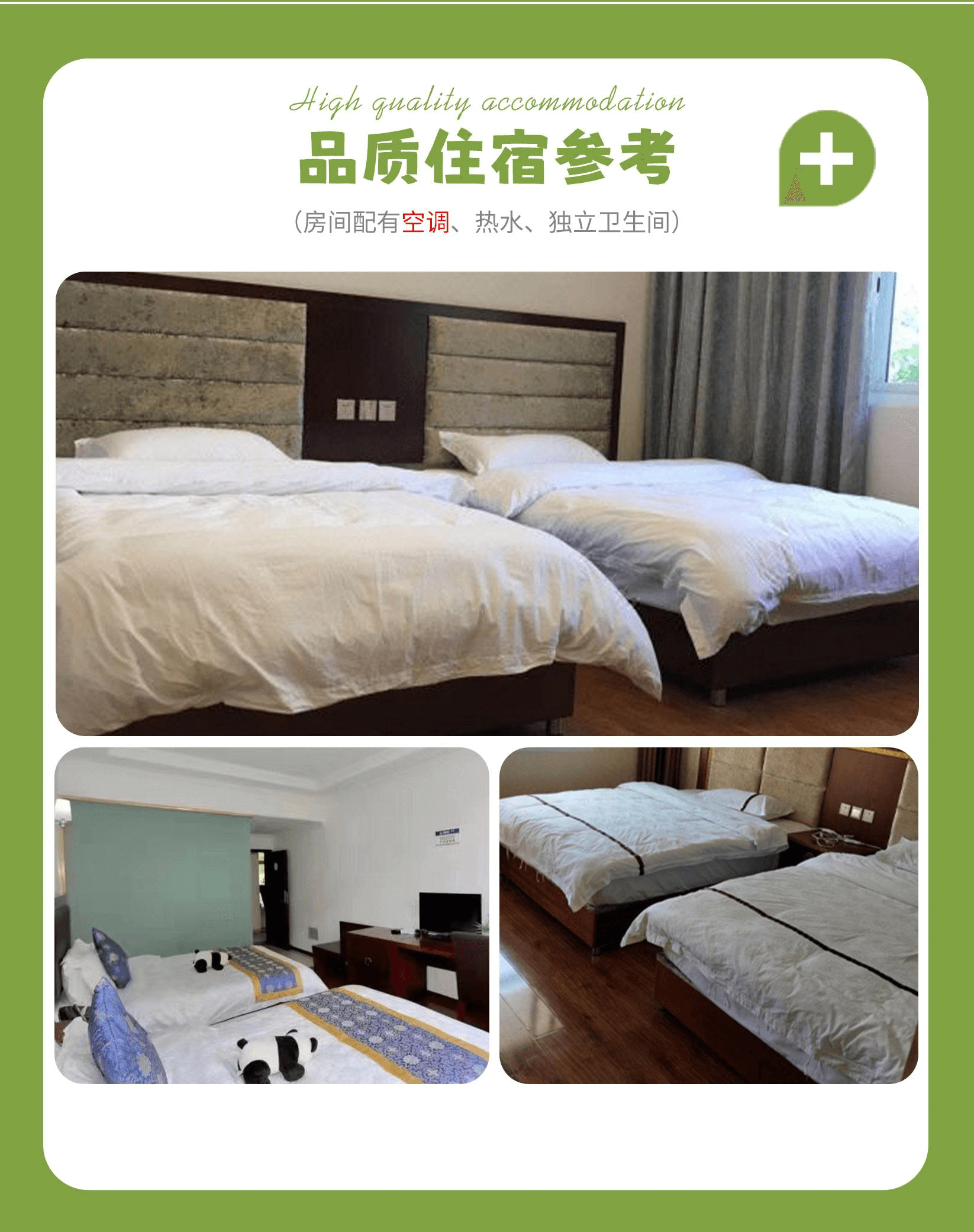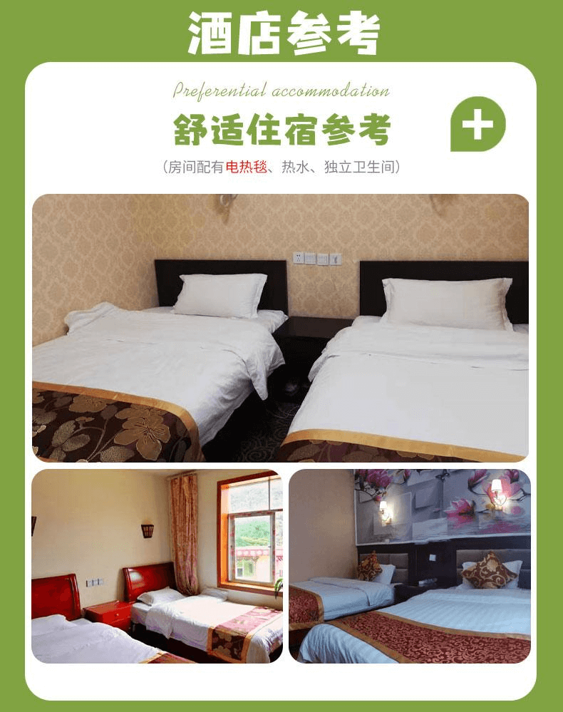 舒適型酒店:圣山大酒店普標、阿爾卑斯酒店普標、多多小院,半景民宿、雄鷹之家、鑫沙名宿、世能客棧、富貴客店、福馨客棧、沙壩山莊、木爾棧、熠煊客棧、鴻福度假山莊或同級酒店;