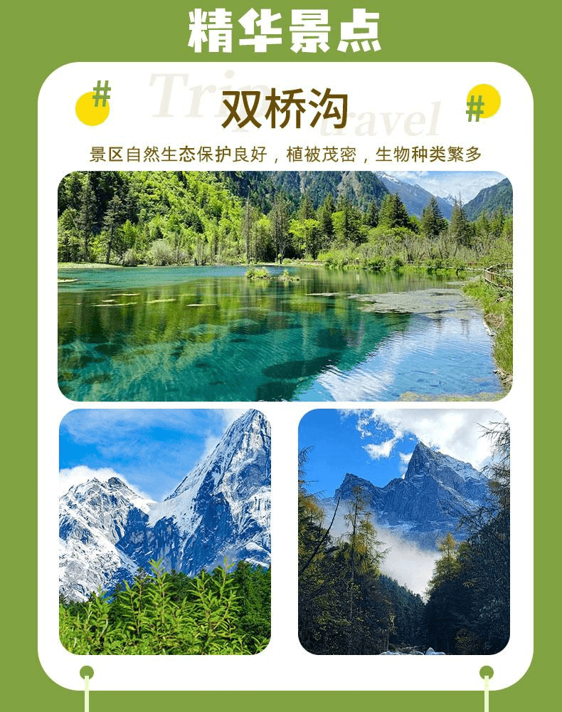 1、精選景點:游覽四姑娘山雙橋溝,長坪溝等景點;