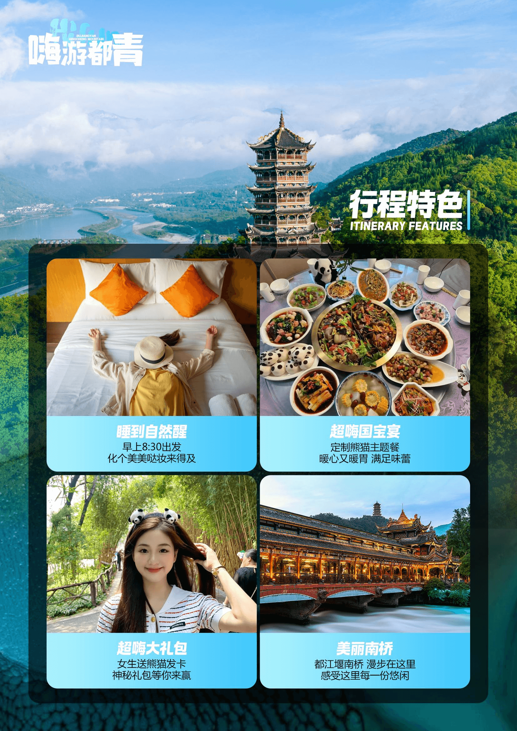 【品質純玩】真純玩,0自費,0購物;【精選景點】打卡都江堰、青城山等網紅景點;【行程輕松】早上7:00出發,定制熊貓主題餐,贈送神秘禮包;