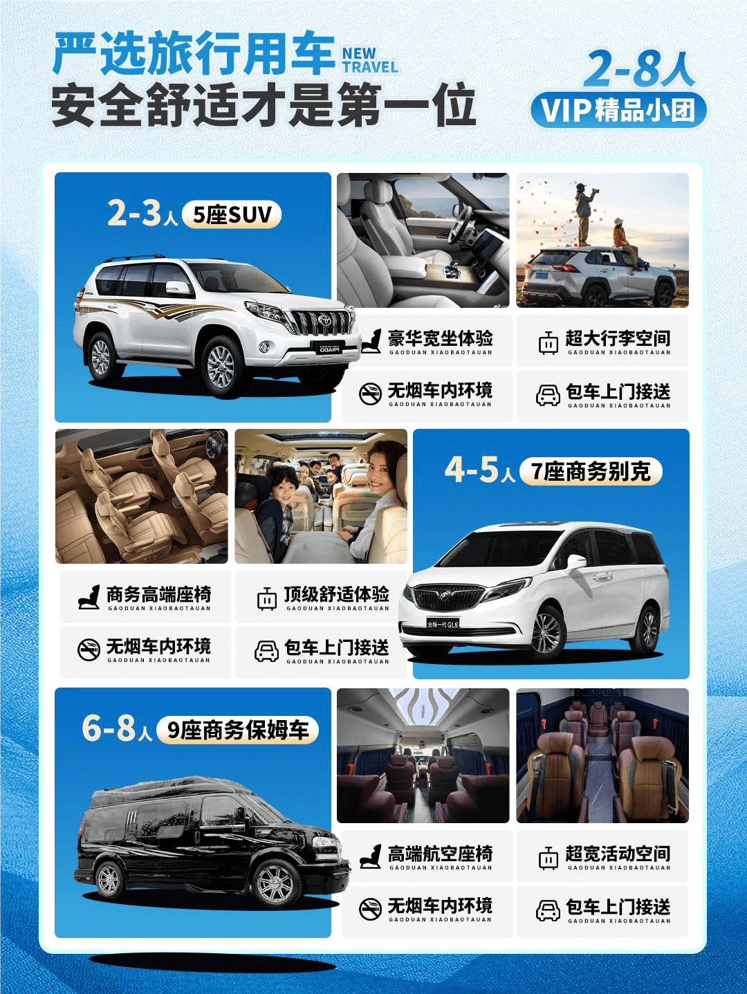 【交通】 2-3 人 5 座轎車或 SUV,4-5 人升級 7 座舒適商務車,6-8 人 9 座豪華商務車,限量免費升級 9 座保姆車(保證一人一座,不指定車型)