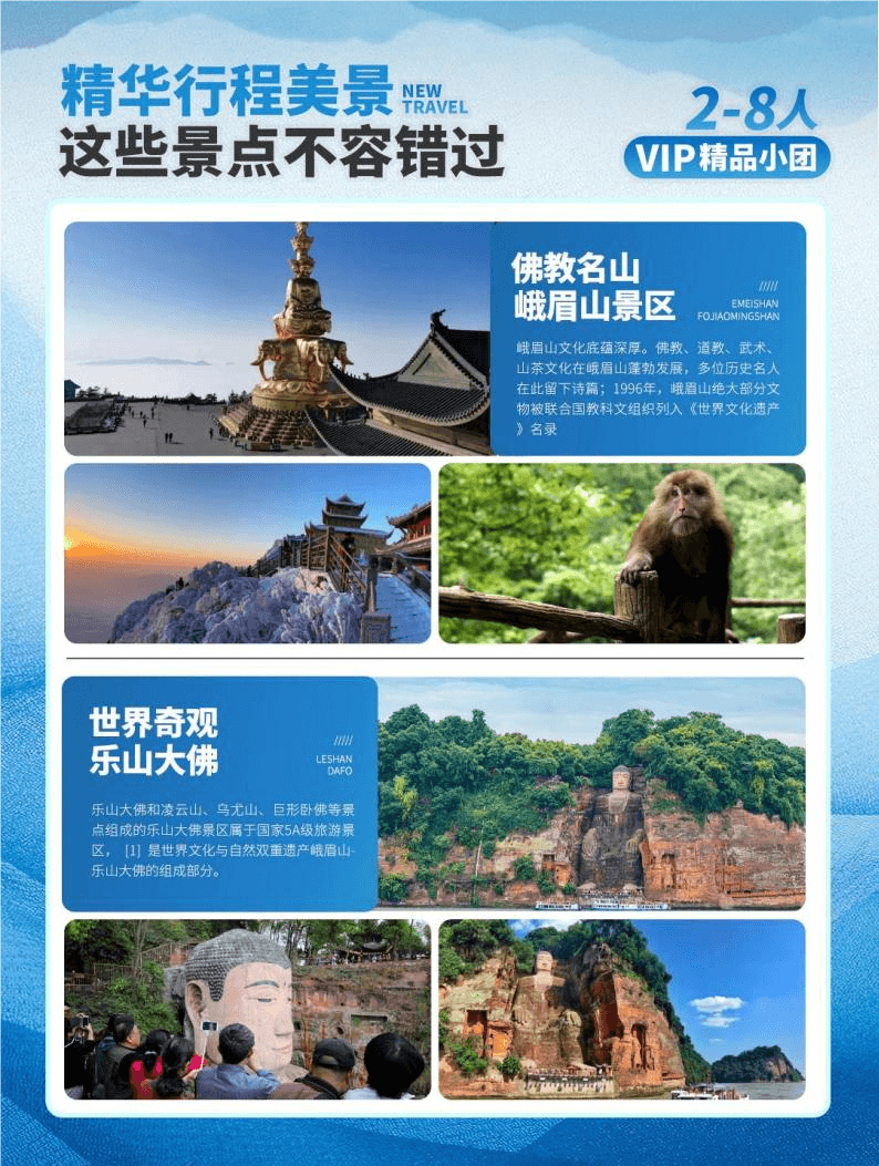 【管家司機】司機兼向導,也是您的旅行管家; 【多選車輛】安全舒適,高端小團用車; 【夜住金頂】夜宿峨眉之巔,觀云海日出;