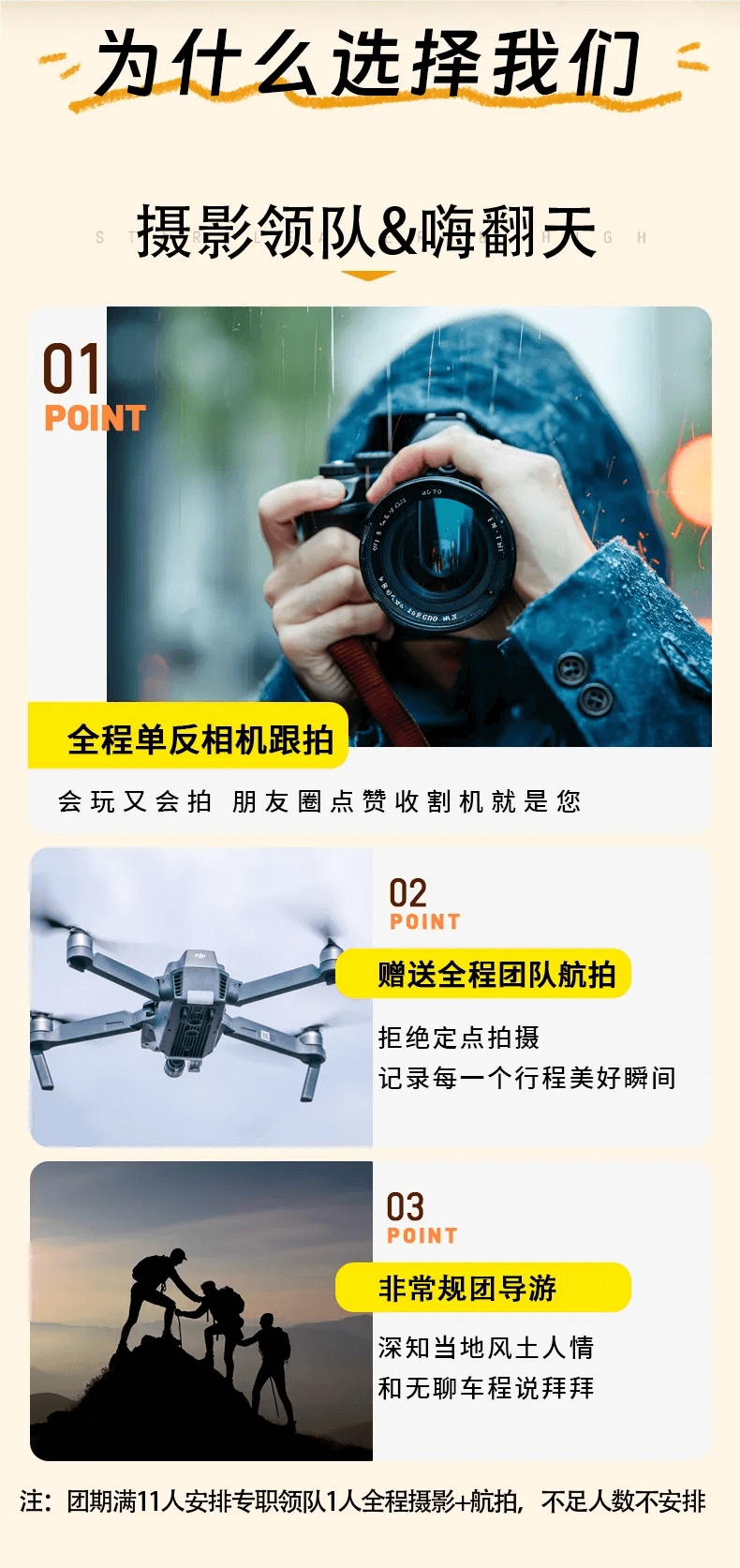 明星領(lǐng)隊:十一人及以上團隊安排攝影領(lǐng)隊帶隊,單反相機+航拍稱霸朋友圈!