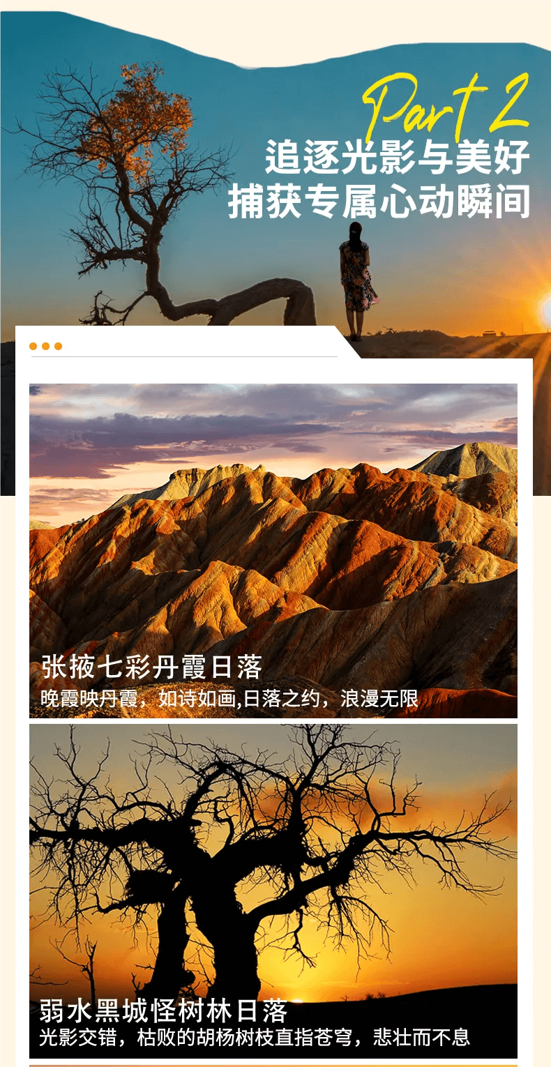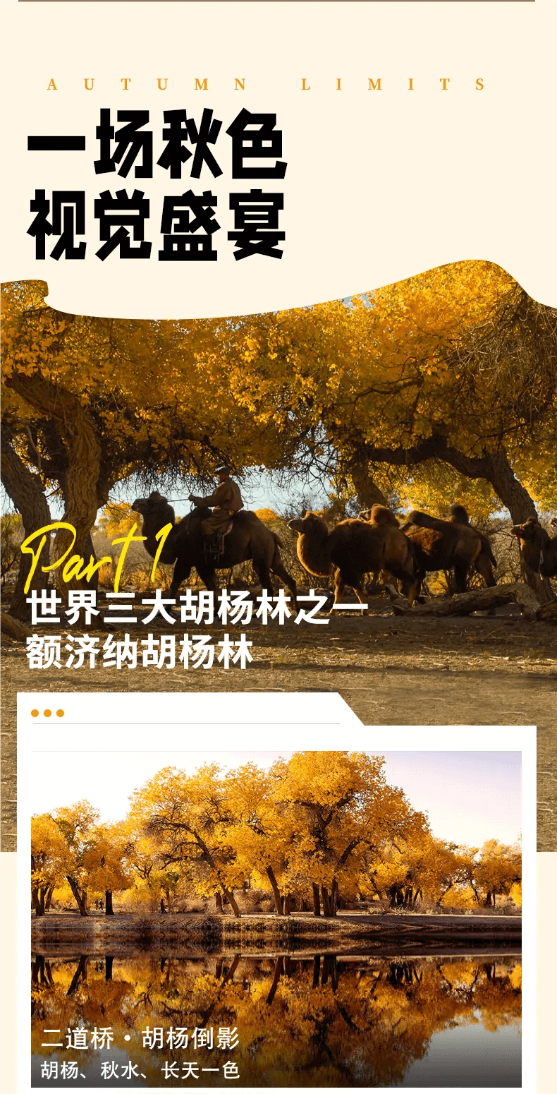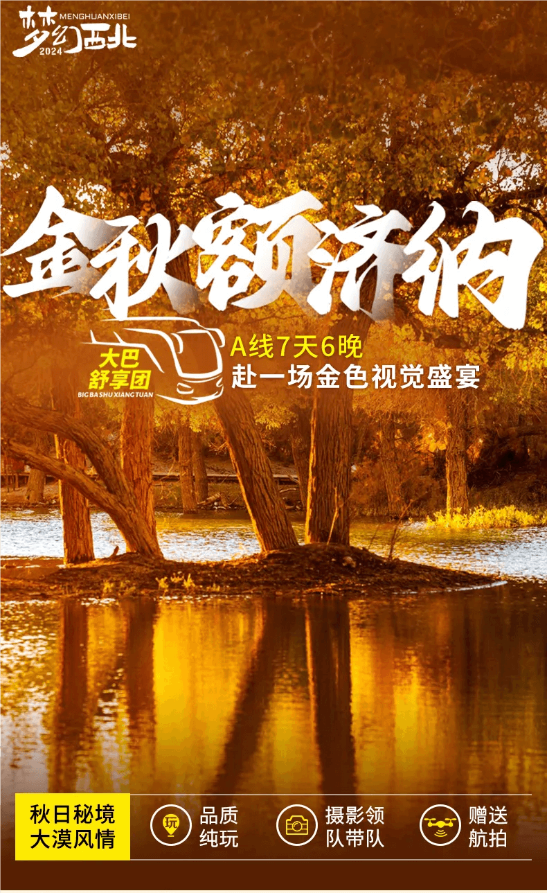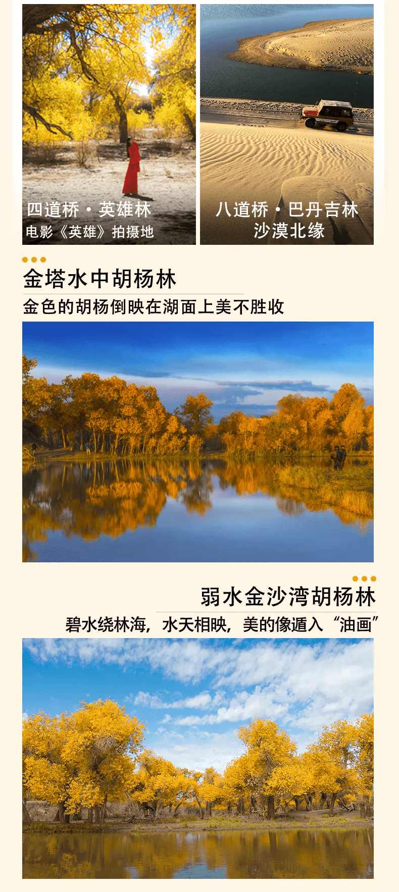 三大胡楊林額濟納胡楊林,弱水金沙胡 楊林,金塔胡楊林,居延海日出,張掖+怪樹林日落,經(jīng)典嘉峪關(guān)/黑城遺址/巴 丹吉林沙漠北緣/天梯山石窟,追逐光影賞秋專線!攝影領(lǐng)隊帶隊,贈送航拍和胡楊拍照神器,制霸朋友圈!