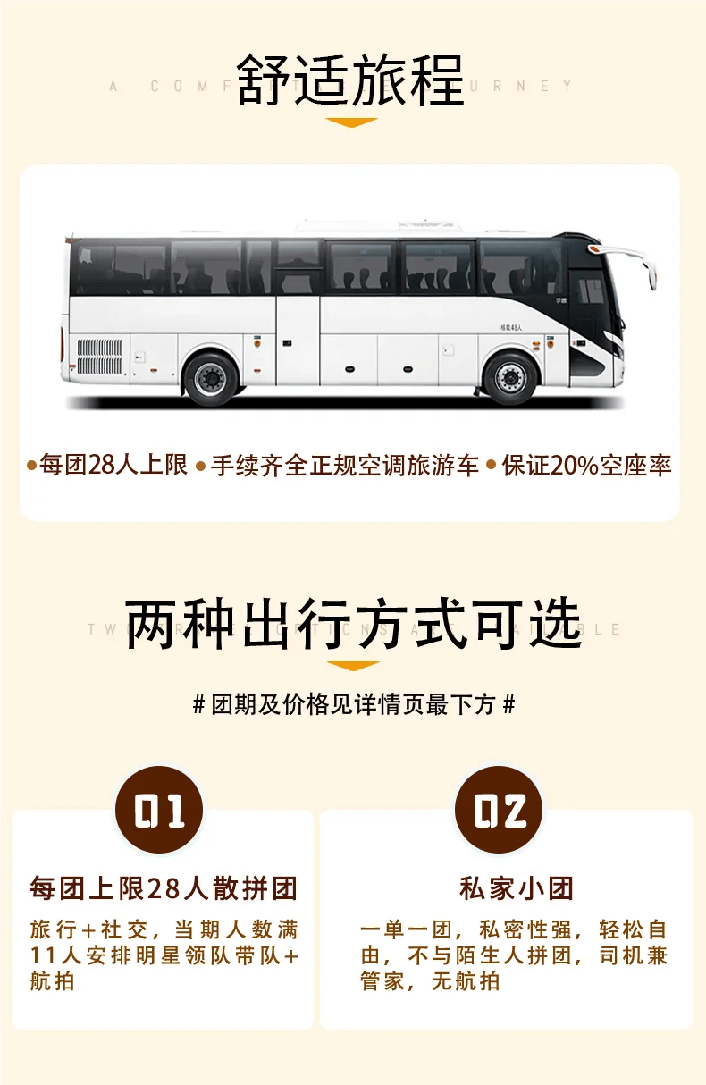 舒適旅程:每團28人上限,保證20%空座率,老司機開路,保障旅途舒適舒心;