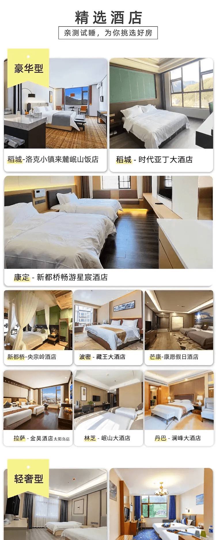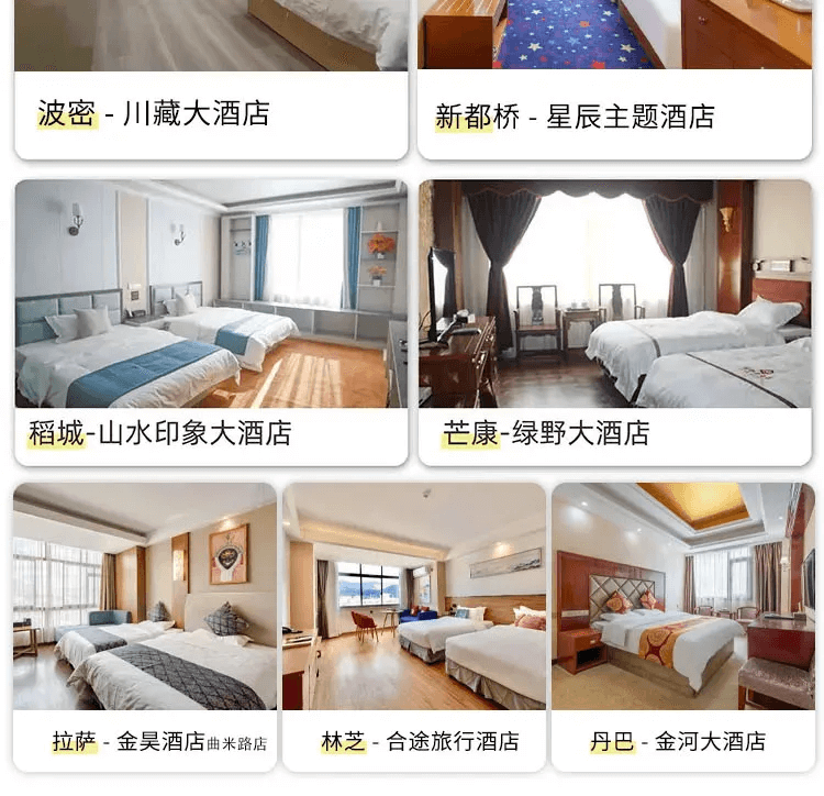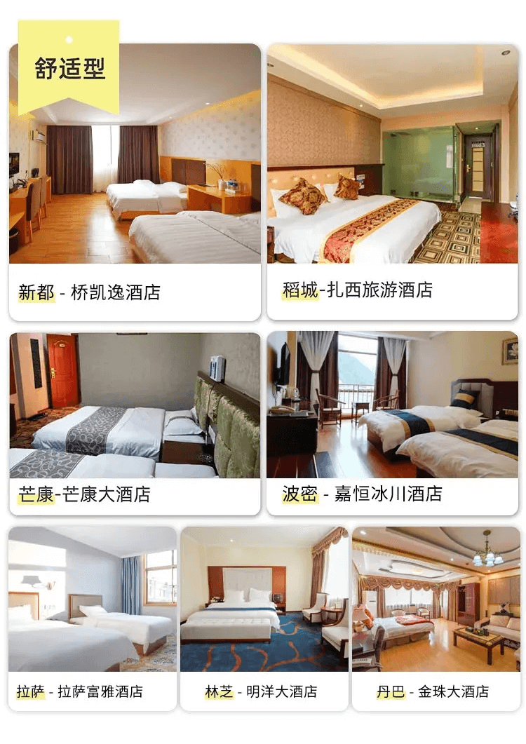 3、住宿:酒店包含行程所列住宿地9晚住宿,雙床房每人1床位;提示:報價均以1人1個床位計價,單人需支付單房差;(藏區(qū)酒店大床房稀缺,有大床需求的客人我司盡量滿足,若酒店無大床則安排雙床)