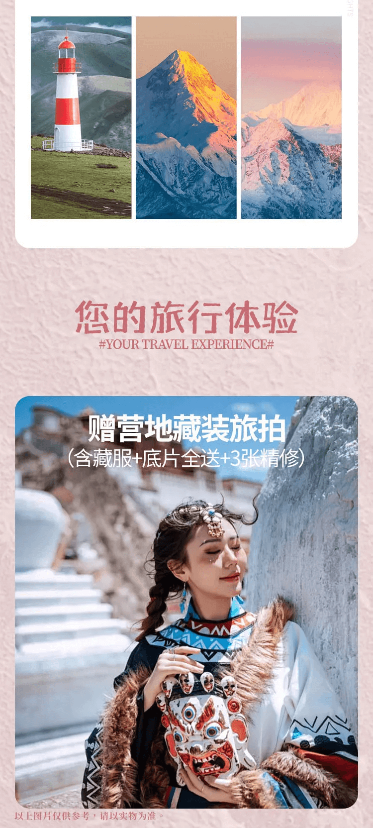 4、關于購物店定義:沿途景區景點、餐廳、廁所、加水點、酒店、高原緩沖服務區內設有小賣部、超市、旅游紀念品、手工藝土特產(包括但不限于牛肉、藏藥、銀飾品、瑪瑙蜜蠟等等)、預防/緩解高反用品等販賣攤點,高原補給服務站有工作人員普及高原反應防范知識等,當地藏民向游客兜售商品等等,均不屬于旅行社安排的購物店范圍,非我社控制,請不要誤解。