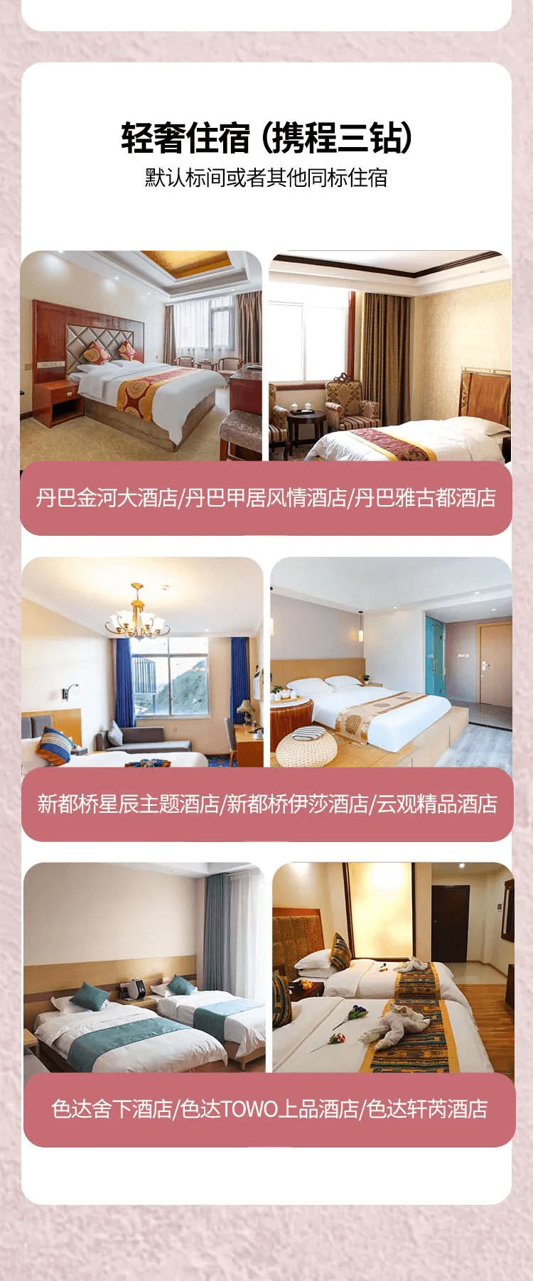 【新都橋】暢游星宸酒店、央宗嶺酒店、新都橋蘭歐尚品、新都橋雅莫林卡、七攝藏香或同級;