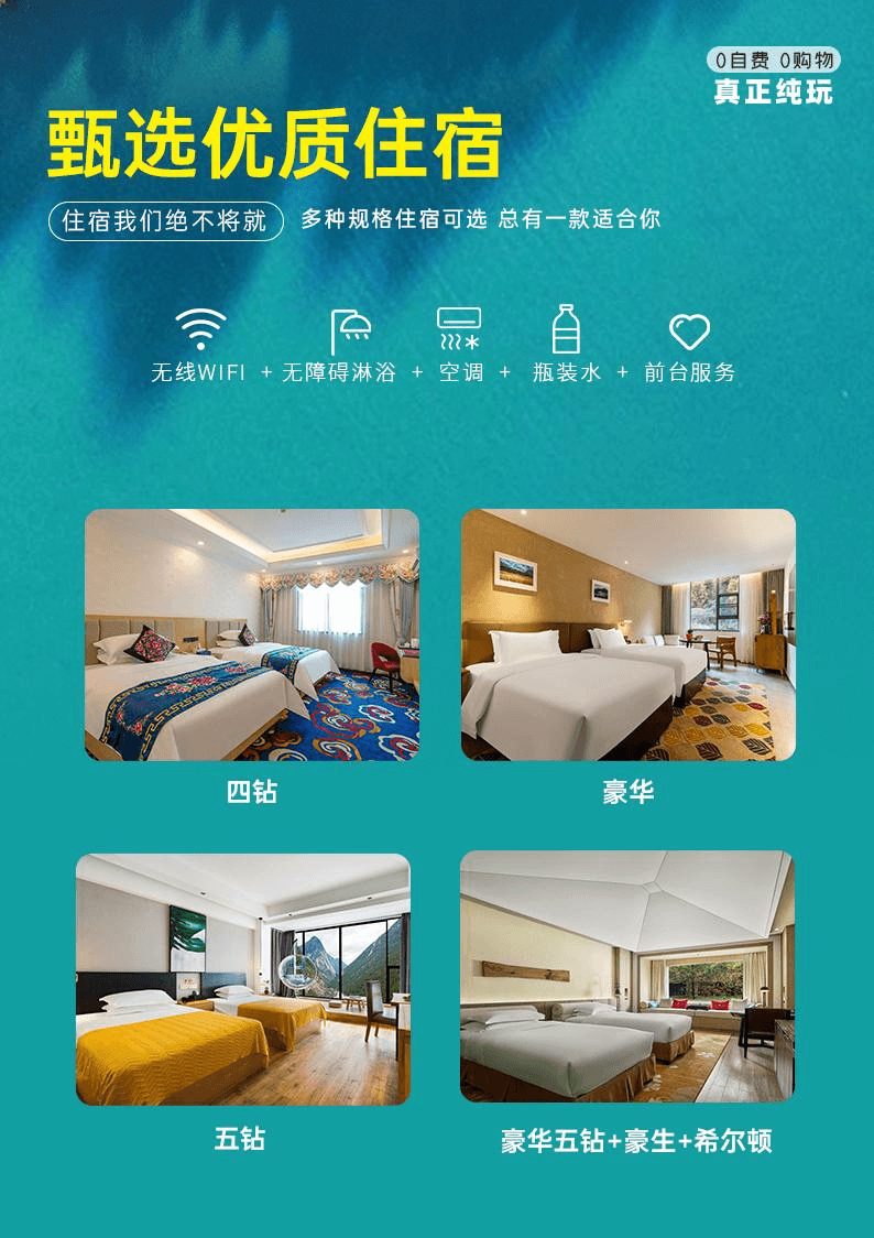 豪華:森林山居、如家商旅、千墨度假酒店、九寨名人、友約國際度假酒店、九寨度假村、景悅度假酒店、名雅大酒店、九源賓館、寰宇大酒店、芷熙酒店、亞朵輕居、西姆山居、九安賓館等同標(biāo)準(zhǔn)酒店