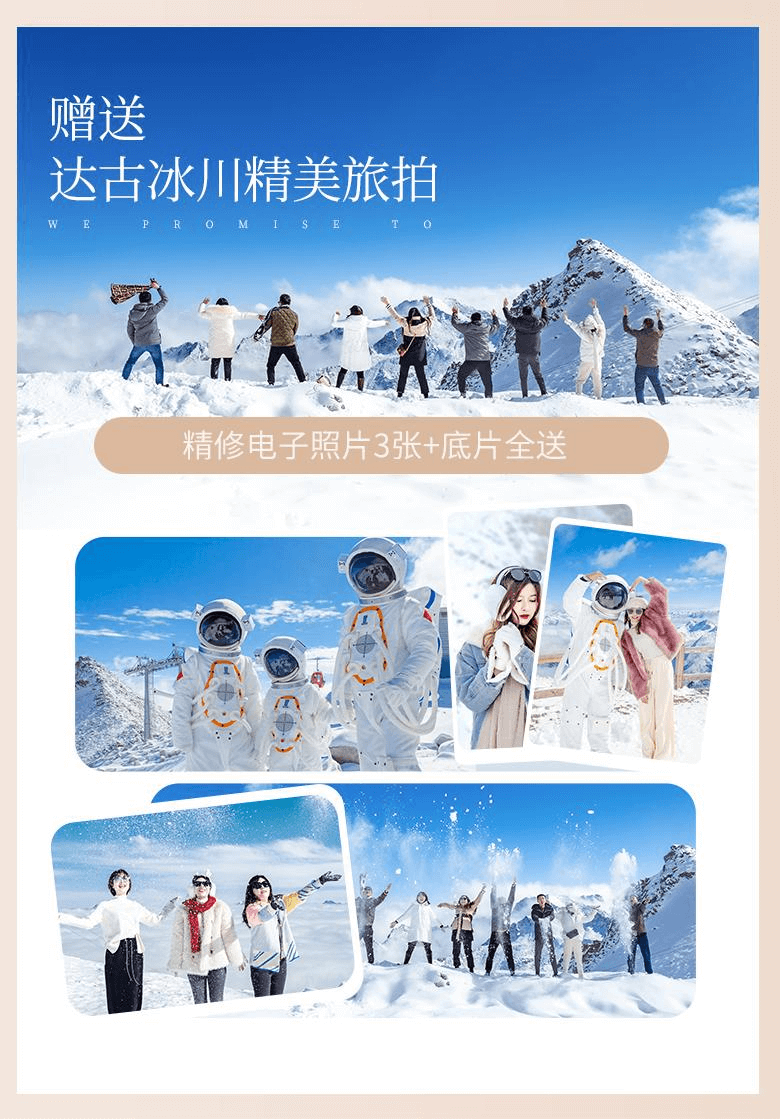 09:00— 14:00 游覽【達(dá)古冰川】(不含中餐建議自帶小零食)(觀光車(chē)自理 70 元/人,游覽該景區(qū),觀光車(chē)必坐)?沿途可游覽【金猴湖】后進(jìn)入藏民風(fēng)情體驗(yàn)區(qū),游覽【上、中、下達(dá)古藏寨】【放生湖】,進(jìn)入高山牧場(chǎng)休閑區(qū)可游覽【達(dá)古湖】,到達(dá)索道下站客人可選擇自費(fèi)乘坐景區(qū)便民設(shè)施,全球第一高海拔觀光索道(索道自費(fèi) 180 元/人,如需到達(dá)達(dá)古冰川山頂,觀冰川全景,需乘坐該索道才能前往)坐索道到達(dá)海拔 4860 米的冰川腹地,融入空曠寂靈的冰天雪地,觀賞一號(hào)冰川,感受一覽眾山小,俯視一切的雄壯氣概,或者徒步游覽【凌云瀑布】 【紅石坡】等景點(diǎn)(游覽時(shí)間約 5 小時(shí))(贈(zèng)送達(dá)古冰川旅拍電子照 3 張)?