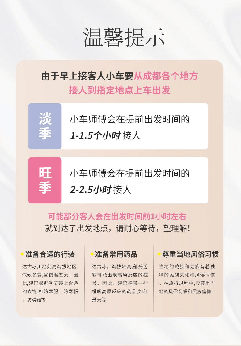 注:此行程免費(fèi)贈(zèng)送成都市三環(huán)內(nèi)包接服務(wù),接人師傅會(huì)在出團(tuán)前一天晚 6 點(diǎn)—9 點(diǎn)與您聯(lián)系,請(qǐng)保持通訊暢通,注意接聽(tīng)電話。