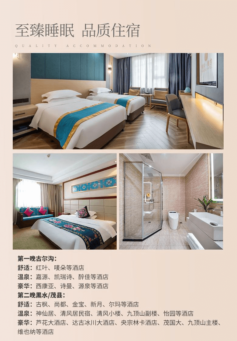 豪華:蘆花大酒店、達(dá)古冰川大酒店、央宗林卡酒店、茂國(guó)大、九頂山主樓、維也納或同等級(jí)酒店。