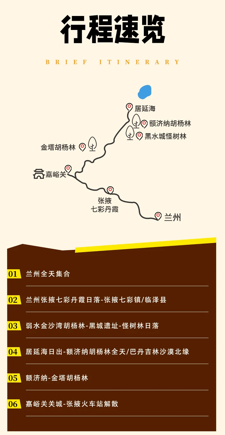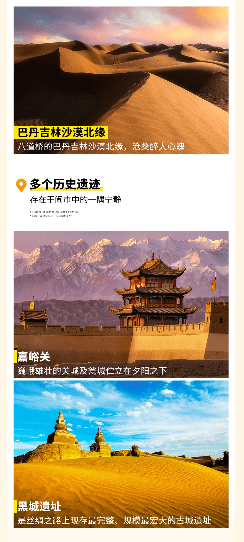4、門票:七彩丹霞+環保車、弱水金沙灣(包含黑城遺址、怪樹林)、額濟納胡楊林+景交車+八道橋景區、居延海門票、金塔胡楊林門票、嘉峪關關城門票;