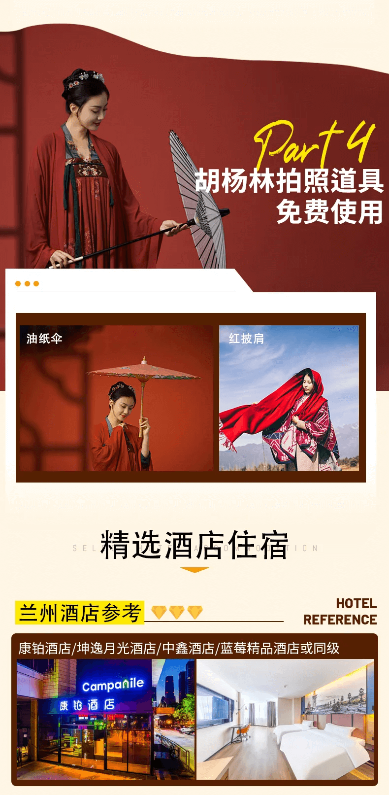 1、住宿:蘭州3鉆/星酒店標間1晚、臨澤或七彩鎮3鉆/星標間1晚、額濟納旗2鉆/星酒店標間2晚、嘉峪關3鉆/星酒店標間1晚