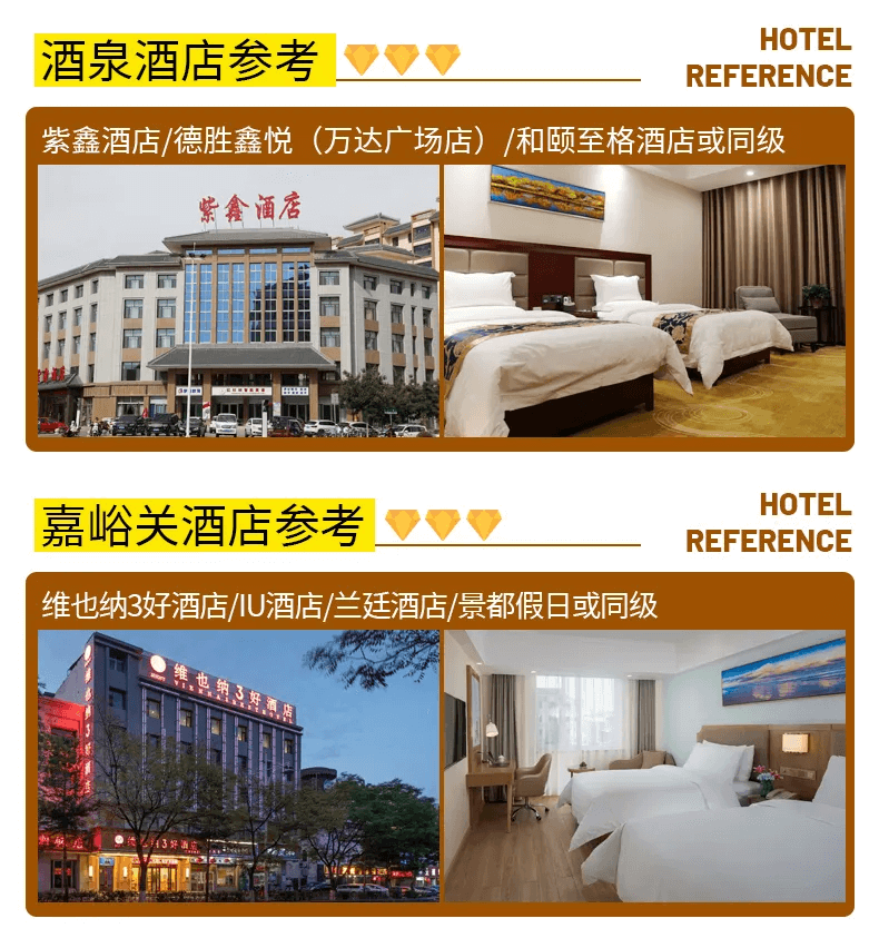 酒泉:3鉆酒店標間1晚參考紫鑫酒店/德勝鑫悅賓館(萬達廣場店)/古道驛館(萬達廣場店)/和頤至格酒店(酒泉西大街店)或同級