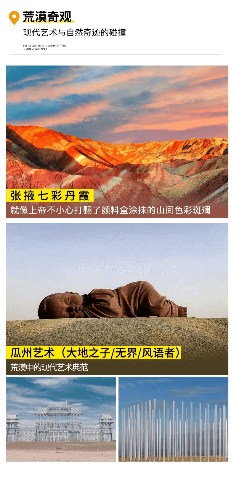 08:00?早餐后出發。前往參觀由現在藝術大師制作的【大地之子】和【無界】【風語者】現代藝術品展覽,感受現代藝術與蒼茫戈壁得完美結合。
