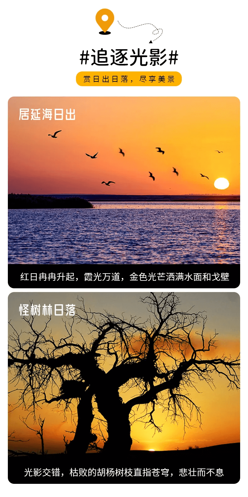 捕光追影:“居延海一生不能錯過的日出”“怪樹林一世不可錯過的日落”一朝一夕,感受光影交錯的視覺盛宴。