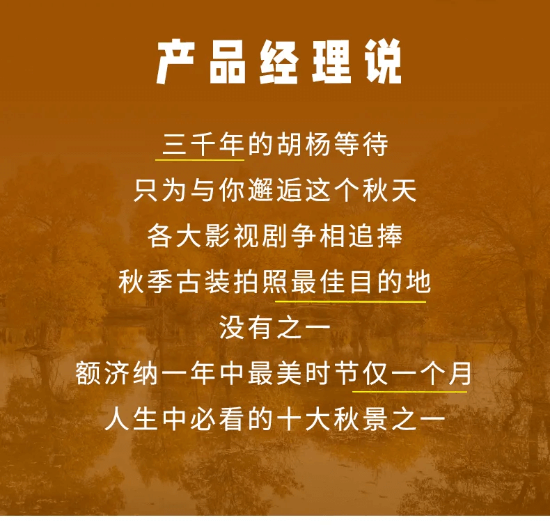 精華秋色:額濟納秋色胡楊林全天游覽,打卡弱水金沙灣胡楊林,贈送胡楊拍照神器(秋景視季節及天氣變化影響可能會有葉子未黃或提前掉落,敬請諒解)