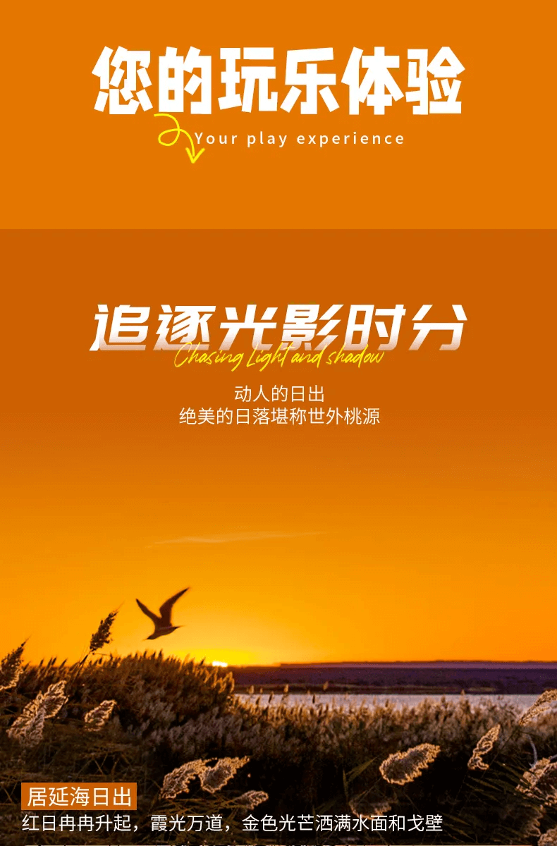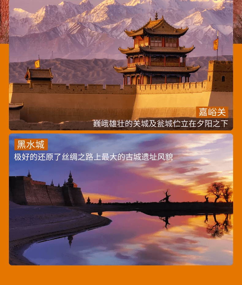 捕光追影:“居延海一生不能錯過的日出”“怪樹林一世不可錯過的日落”一朝一夕,感受光影交錯的視覺盛宴。 經典打卡:敦煌莫高窟,鳴沙山月牙泉,張掖七彩丹霞,嘉峪關,黑城遺址,只在最合適的時間前往最合適的地方!