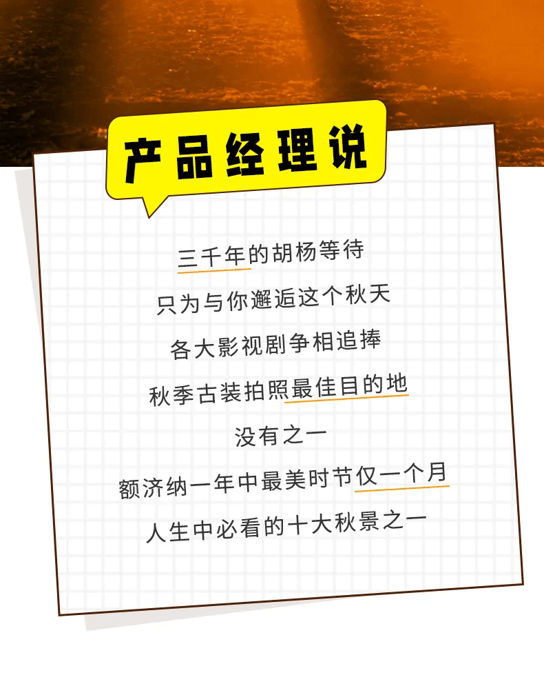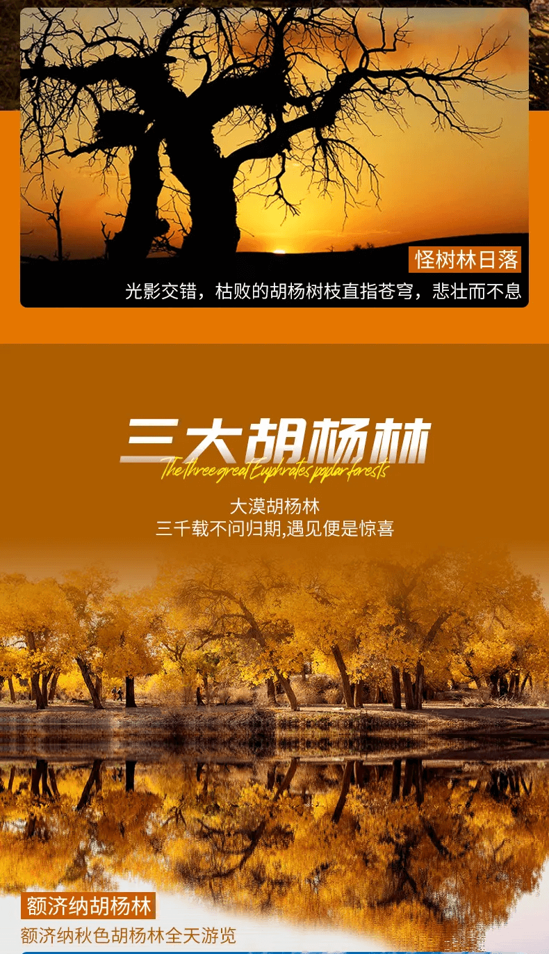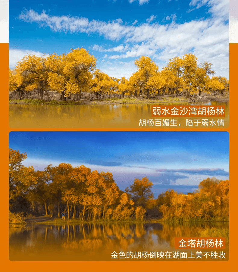 精華秋色:額濟納秋色胡楊林全天游覽,打卡弱水金沙灣胡楊林,贈送胡楊拍照神器(秋景視季節及天氣變化影響可能會有葉子未黃或提前掉落,敬請諒解)