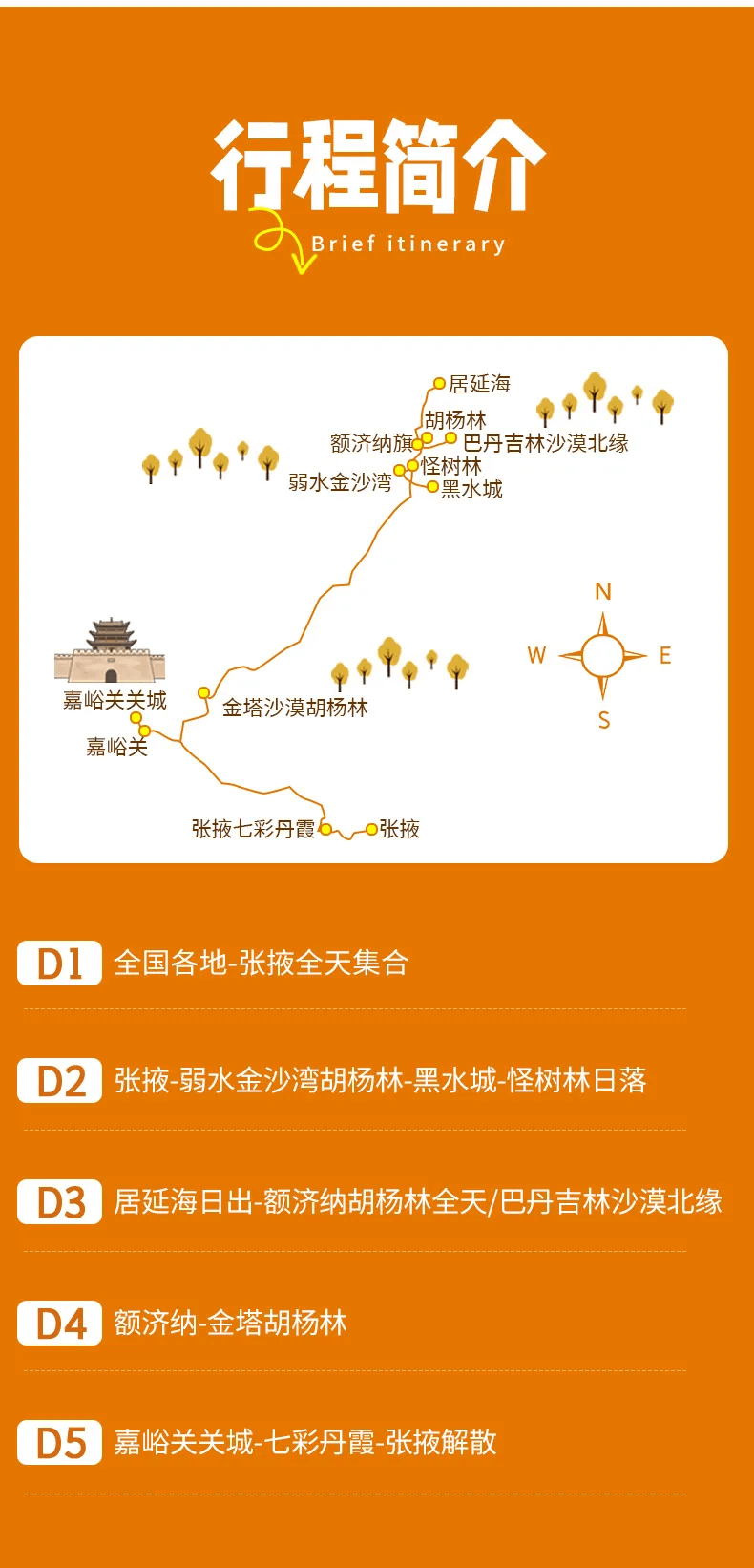 4.門票:弱水金沙灣(包含黑城遺址、怪樹林)、居延海門票、額濟納胡楊林+景交車+八道橋景區、金塔胡楊林門票、嘉峪關關城門票、七彩丹霞+環保車;
