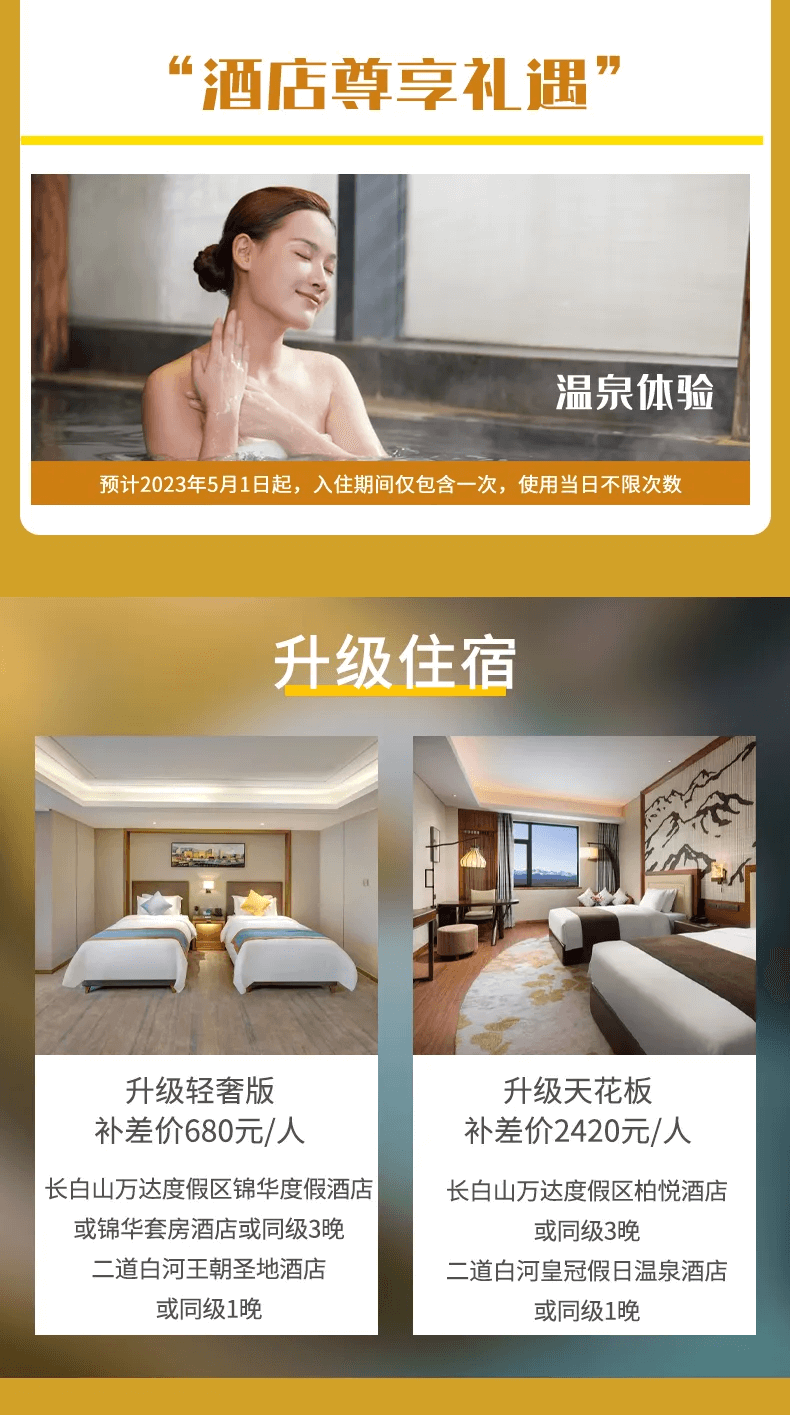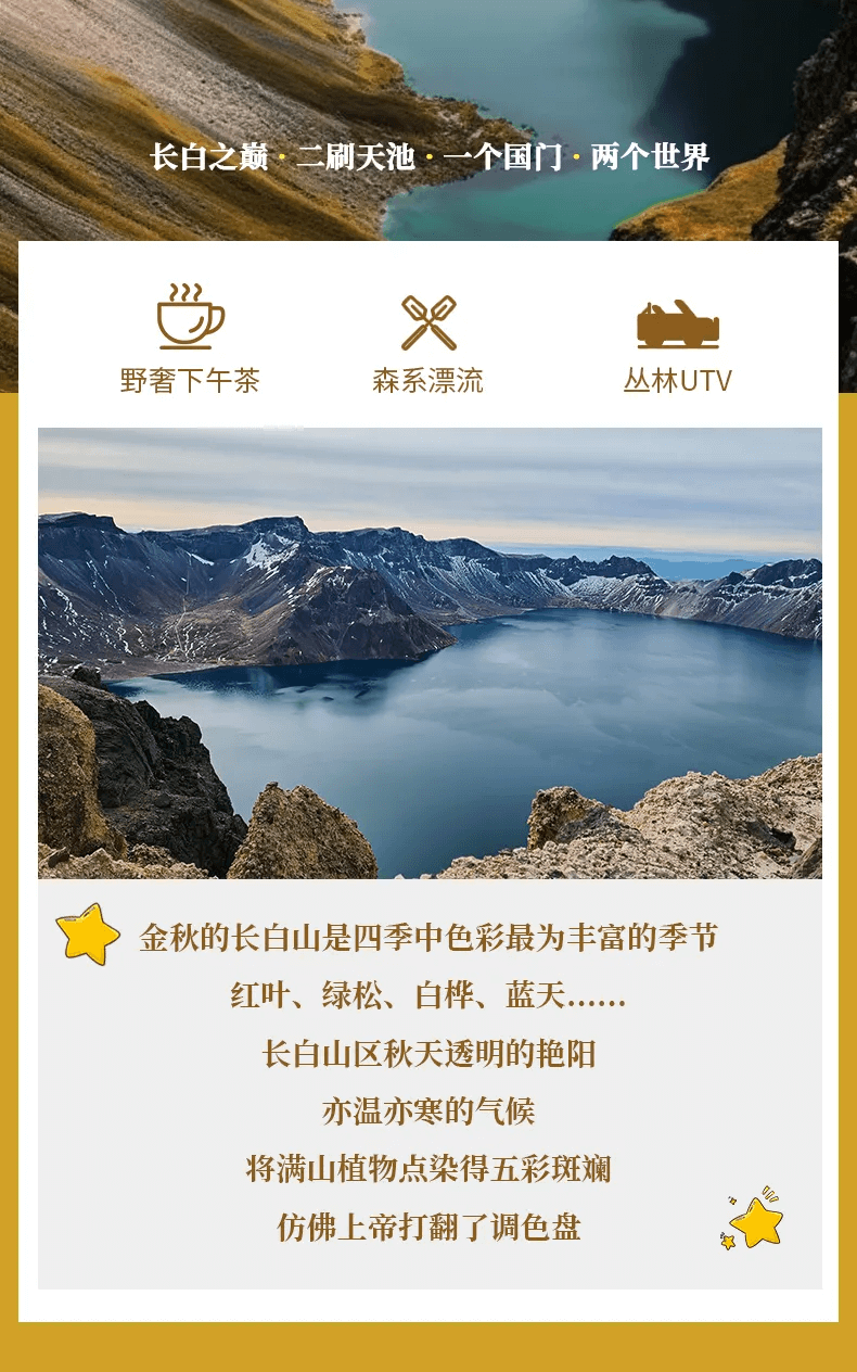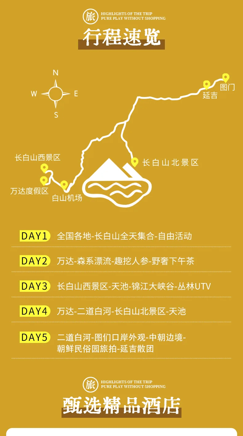 網紅玩法:長白山萬達度假區森系漂流、趣挖人參、叢林UTV、野奢下午茶、朝鮮民俗園旅拍; 精華美景:大美長白山西北連游、圖們口岸、東北“小首爾”;