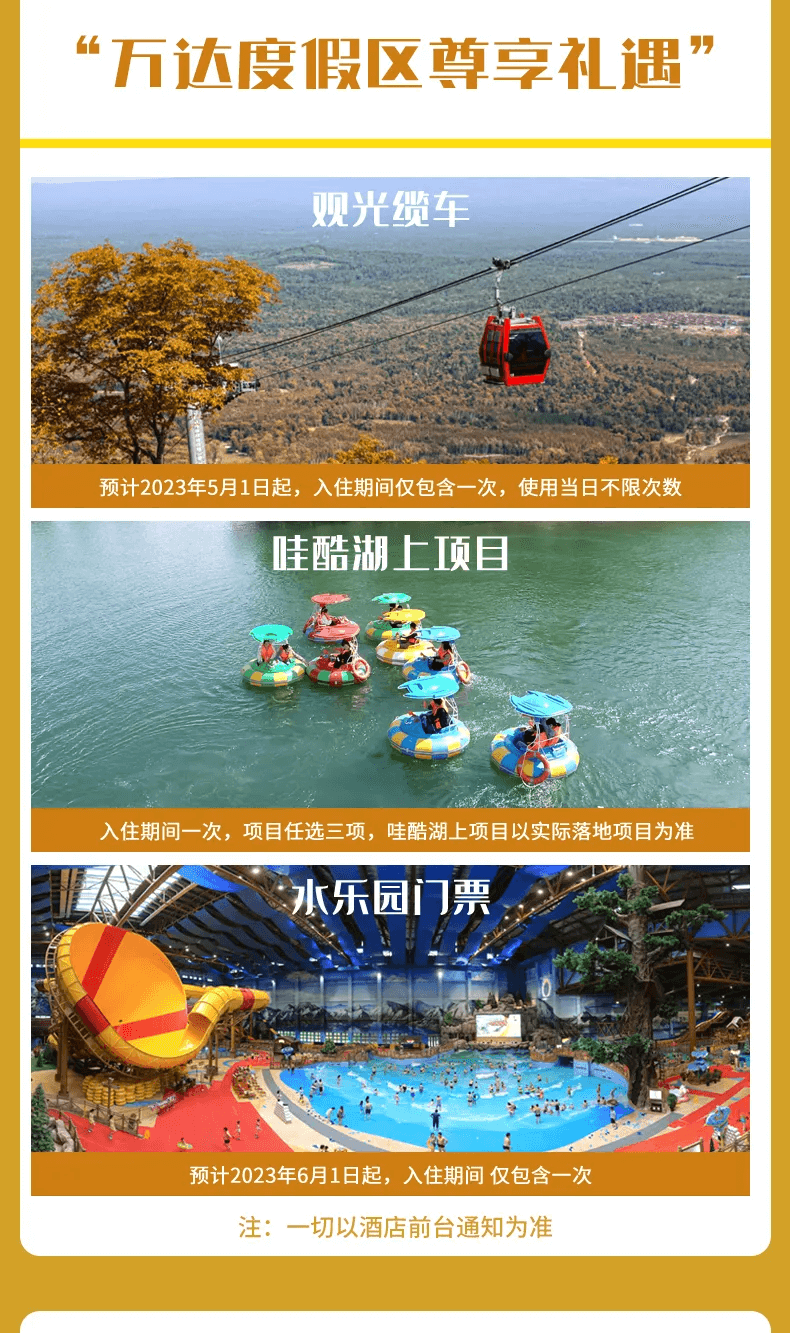 開啟我們的休閑度假時光,前往酒店辦理入住,辦理后憑本人有效身份證件和酒店給予的入住憑證前往相應區域享受禮遇 ,可自己的喜好選擇參加贈送禮遇活動;以下禮遇均為贈送項目,不參加不退費用,具體開放時間以及游玩項目已度假區公布為準!