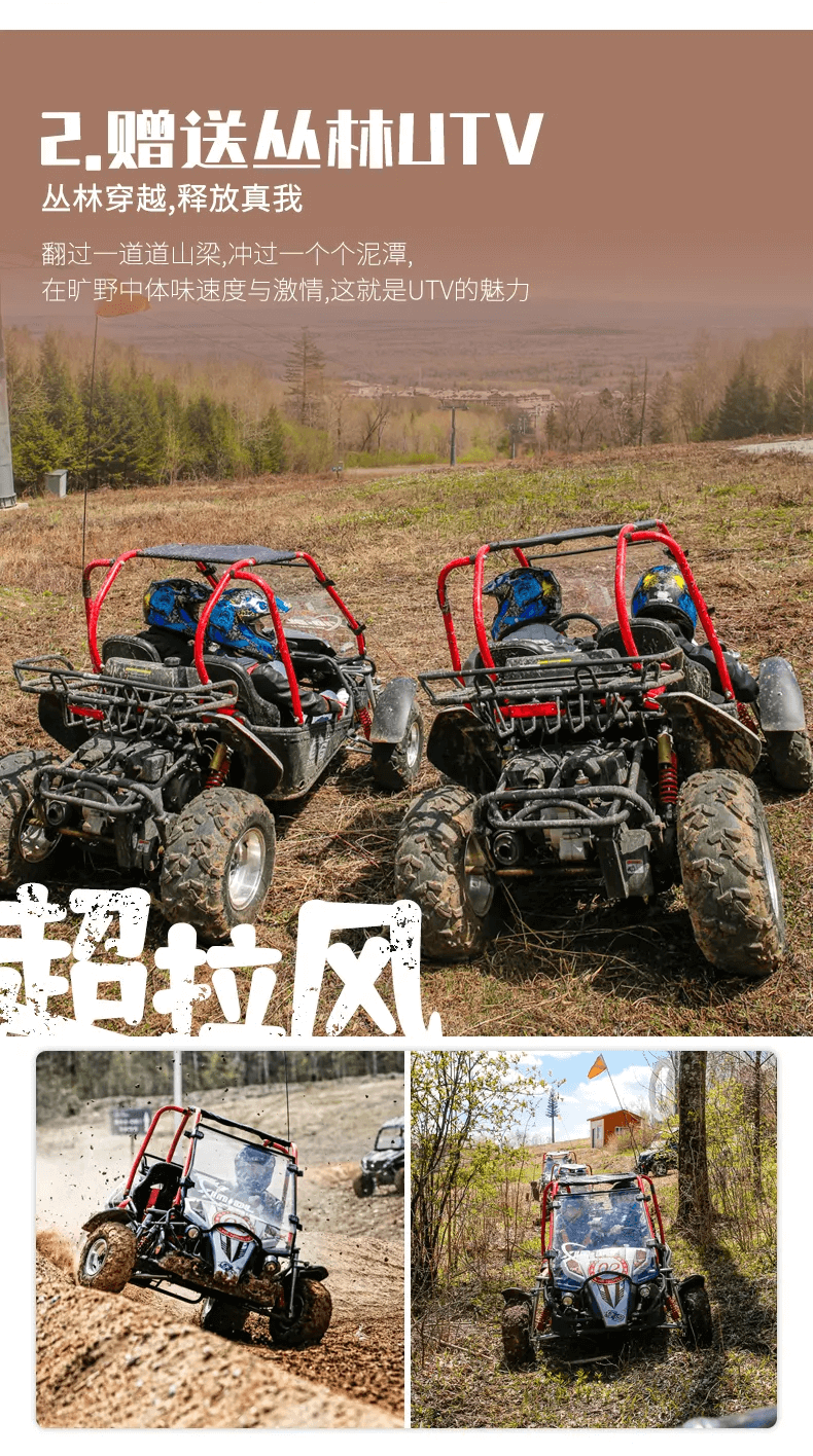 10:30?前往【叢林UTV】,它具有強(qiáng)勁的攀爬能力,能夠適應(yīng)各種地形,所以它能在沙灘、叢林、山地、雪地、河流、沼澤及沙漠、草原等復(fù)雜地形區(qū)自由行駛,堪稱全能的行動工具。穿越叢林,越過土坡,直往山林深處!馳騁在泥濘山路,御風(fēng)感受越野的狂野!大山中起伏的刺激感,瞬間點(diǎn)燃體內(nèi)洪荒之力!