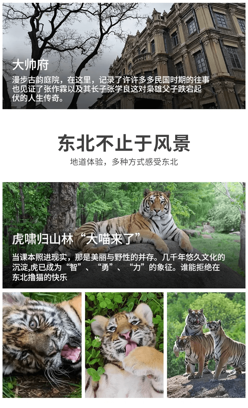 14:00? 抵達【東北虎林園】,世界上最大的東北虎人工飼養繁育和野化訓練基地,近距離拍攝東北虎的照片,感受“森林之王”的“萌”與“猛”!