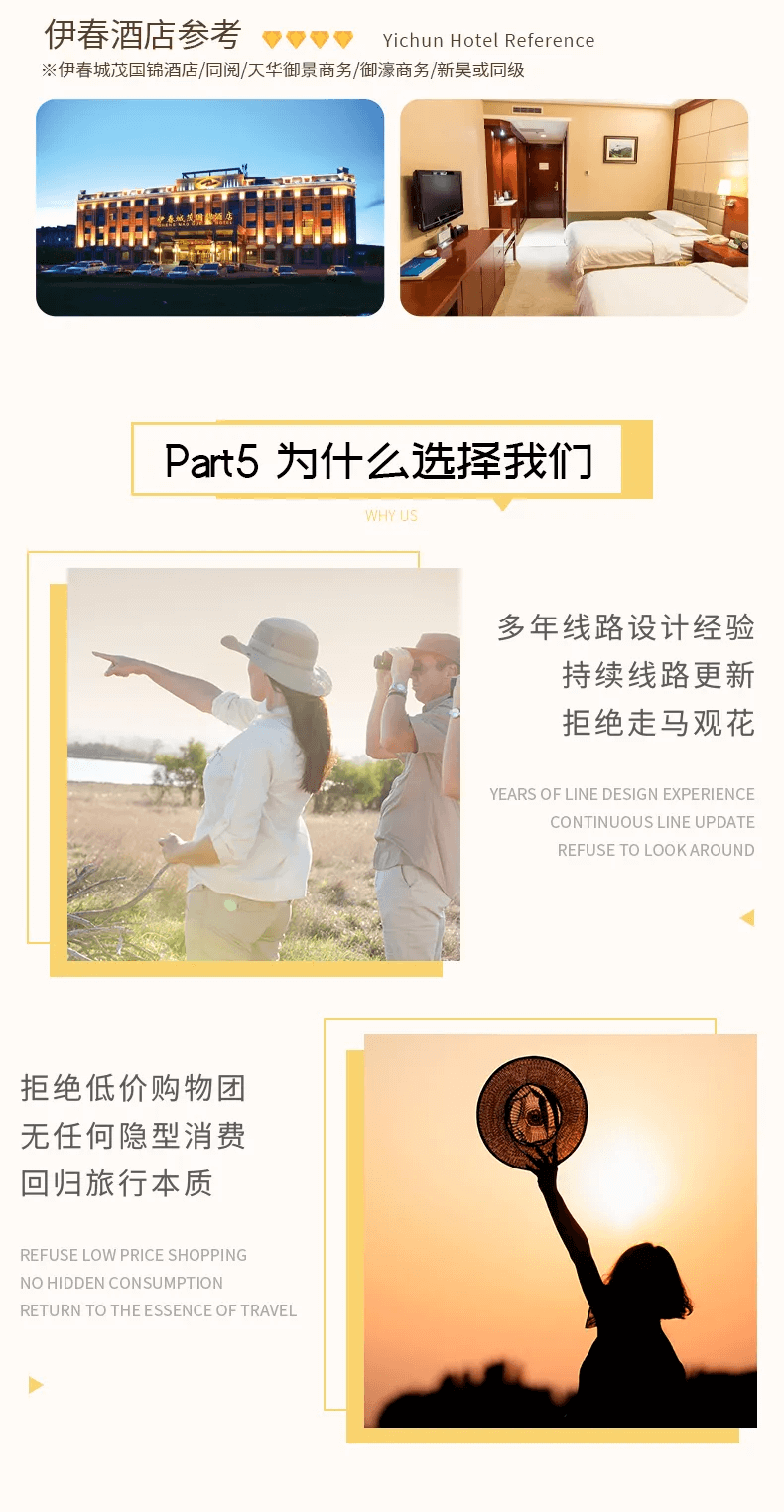 4.門票:扎龍濕地含環(huán)保車,五大連池(龍門石寨/溫泊/北藥泉/格拉球山天池),五營國家森林公園門票含環(huán)保車,湯旺河林海奇石風(fēng)景區(qū)門票含環(huán)保車,金山鹿苑門票;