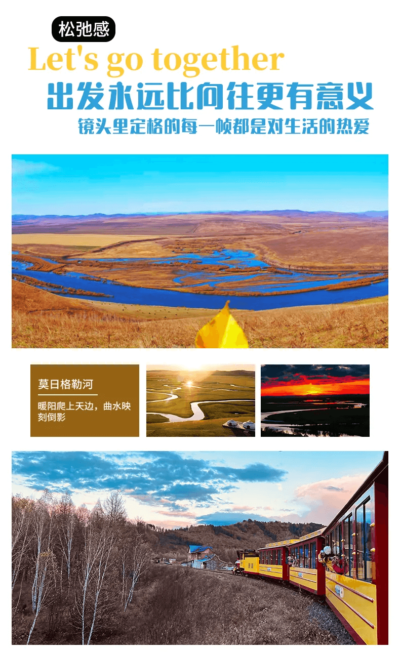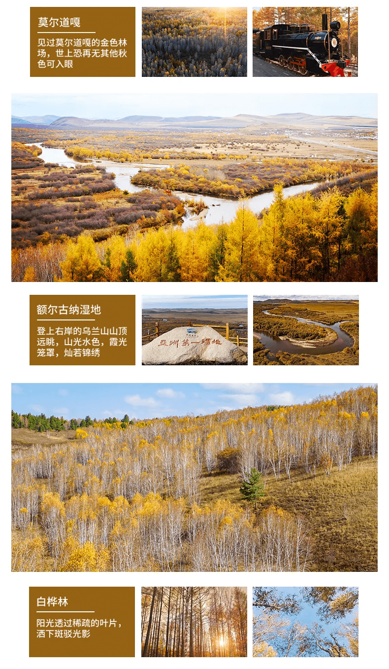 4.門票:扎龍濕地門票+環保車、阿爾山森林公園門票+環保車、國門景區門票、額爾古納濕地門票+環保車、莫爾道嘎門票+森林小火車、敖魯古雅門票+環保車、白樺林門票+環保車;