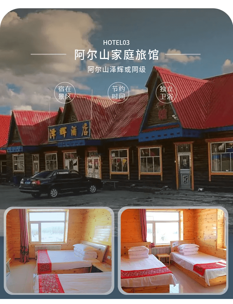 1.阿爾山景區內住宿有興安盟和天池服務區,適時根據資源情況安排住宿,住宿環境可能無法和城市相比,敬請諒解。