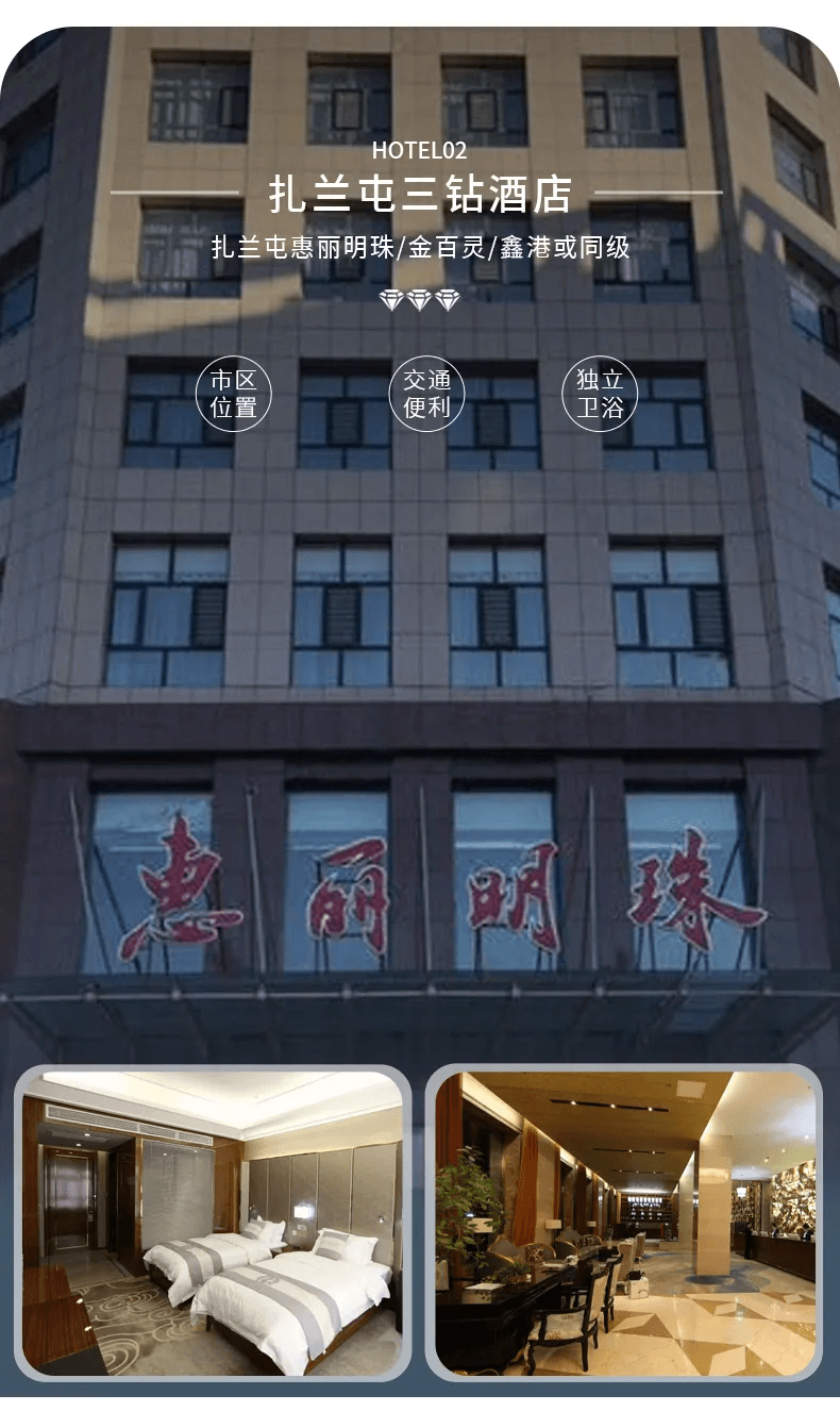 特色住宿:哈爾濱四鉆酒店,扎蘭屯三鉆酒店,阿爾山家庭旅館,滿洲里四鉆,額爾古納三鉆酒店,恩和特色木刻楞,根河三鉆酒店,海拉爾三鉆酒店,酒店精心挑選,不同風格,不同感受;