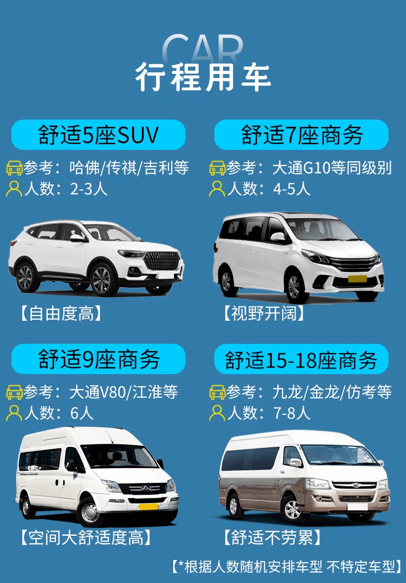 3、用車:2-3人用5座SUV,4-5人用7座商務車,6人用9座商務車,7-8人用15座旅行巴士,小車留有空座不擁擠,保證旅途舒適舒心。(小團副駕駛及前后座位置需要輪流乘坐,望悉知);