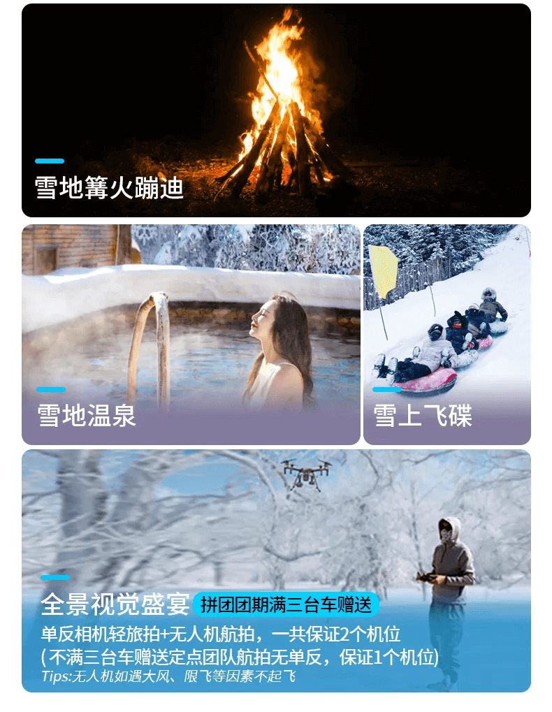 無人機航拍:拼團滿三臺車贈送單反相機輕旅拍+無人機航拍,一共保證2個機位,多視角多機位玩爆東北,贈送電子視頻,秒殺朋友圈!(如遇大風、限飛等因素不起飛) 嚴選住宿:三晚某程4鉆酒店,一晚雪鄉(xiāng)特色農(nóng)家炕(圣誕/跨年/元旦/春節(jié)團期為男女分開4人間拼炕);