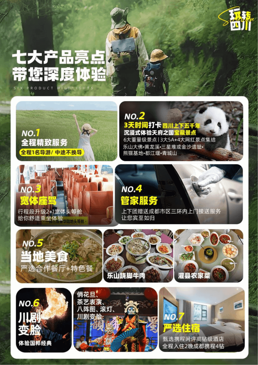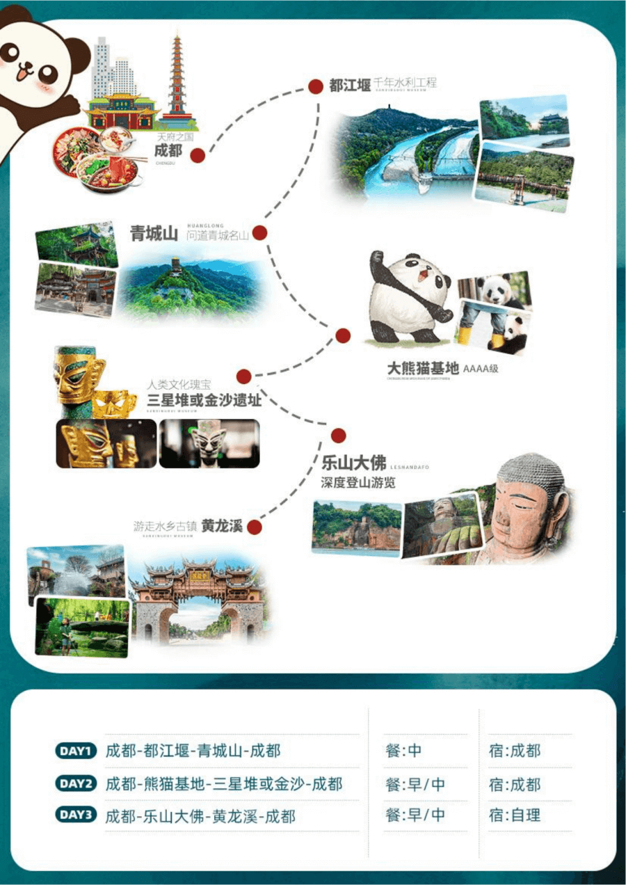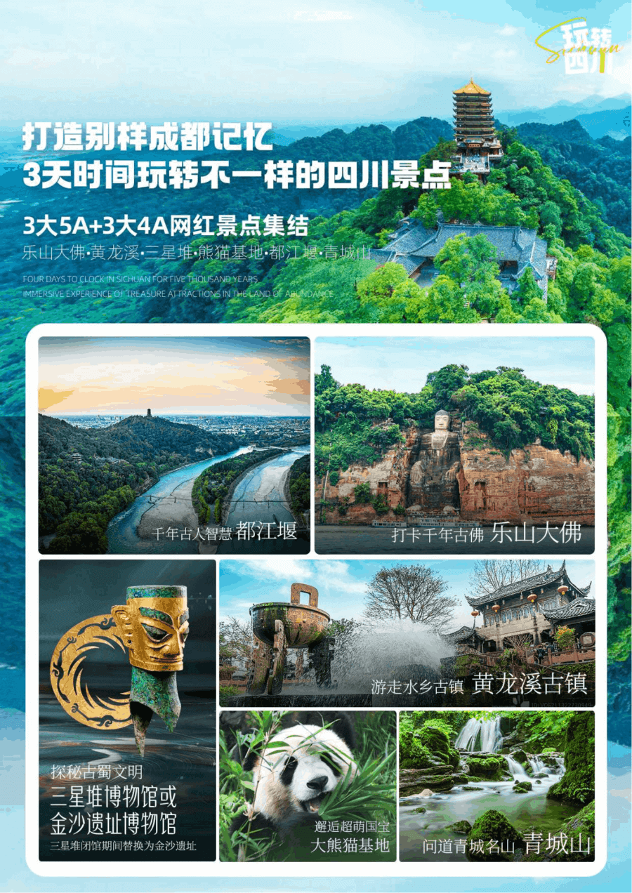 [玩轉(zhuǎn)四川]3 天時間玩轉(zhuǎn)四川 6 大頂流景點,打造別樣四川記憶3 大 5A×3 大 4A 網(wǎng)紅景點集結(jié)+景點大門票全含不玩貓膩 都江堰/青城山/三星堆或金沙遺址/熊貓基地/樂山大佛/黃龍溪古鎮(zhèn) 道教名山,千年水利,超萌國寶,古蜀探秘,千年古佛,歷史古鎮(zhèn)