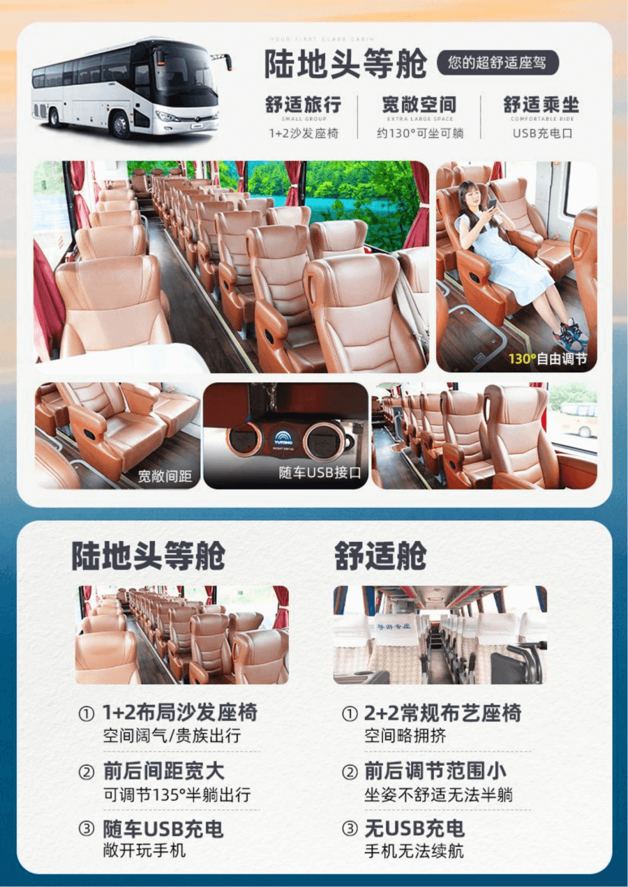 1、【用車】行程段空調(diào)旅游車(2+1 寬體頭等艙),一人一正座,不提供座次要求;散客拼團全程可能非同一臺車; 散客接為旅行社贈送擺渡車成都市內(nèi)三環(huán)路內(nèi)包接送,接送均不配導(dǎo)游, 2+1 寬體頭等艙:皮質(zhì)座椅,獨立安裝,獨立自由調(diào)節(jié),每排座位僅 3 座,每排座位間距寬,車配 USB 充電口(頭 等艙車型最后一排為 4 座,應(yīng)急安全門及最后一排座椅無法調(diào)整!) 車導(dǎo)說明:本產(chǎn)品屬于小眾產(chǎn)品,如若當天成團人數(shù)未滿 9 人(≤9 人),采用 5-15 座商務(wù)艙車型,同時無導(dǎo)游(行程安排 為司機兼向?qū)В?nbsp;