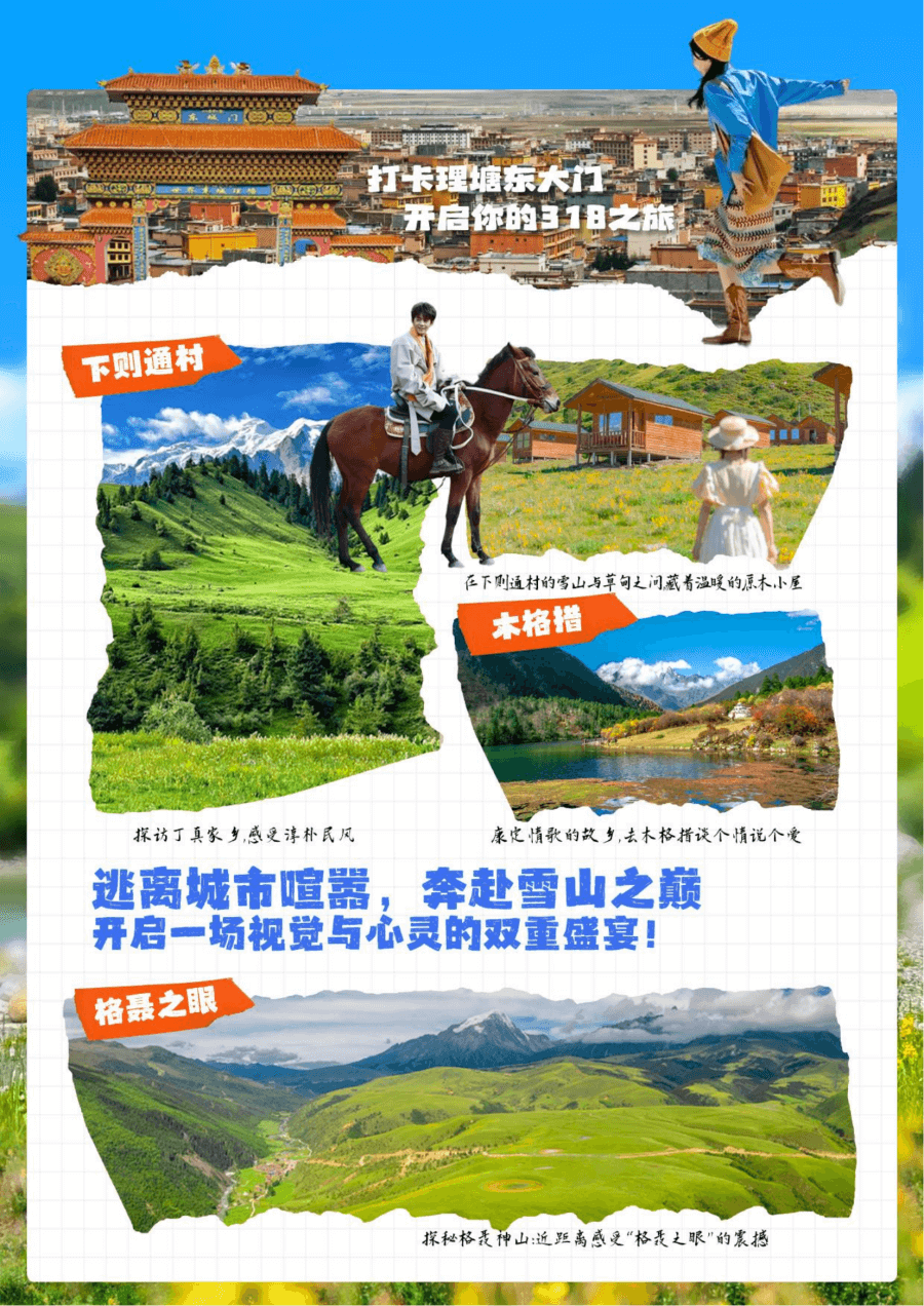 ?早上:早餐后乘車前往理塘,后乘坐當地面包車(擺渡費 200/人自理)前往下則通村【小木屋】(游玩不低 于 20 分鐘游覽時間)這里有川西版的《海蒂和爺爺》小木屋,附近有很多雪山花海,散落一排的小木屋與格 聶神山相連氛圍超絕,像極了瑞士。向遠處望去就是丁真的家鄉,在這里生活的人是多的幸福 ,后前往丁真 家鄉--然日卡村,沿途可以感受野溫泉。?