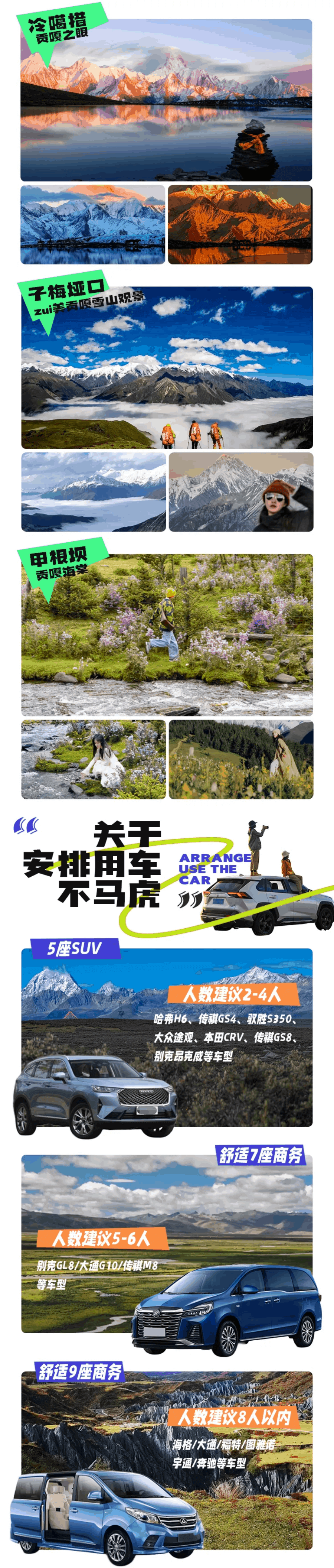 想去子梅埡口看日出的游客,可約伴一同前往【子梅埡口】(自愿選擇,非必須游玩景點,如遇管制或大雪取消;中轉(zhuǎn)車自行與當?shù)卮迕裾剝r,一般包車價格600/元(5座)-800/元(7座)往返)預計往返+游玩3小時。如不去【子梅埡口】的小伙伴可在客棧睡到自然醒,可周邊自由活動按約定時間出發(fā)返回成都。途徑田園風光網(wǎng)紅打卡地【甲根壩】,后在【折多山】埡口(游覽不低于10分鐘)(如遇折多山堵車或大雪,則換道434國道返程,取消折多山埡口景點,介意慎拍!)拍照紀念后,預計晚上7-8點到達成都,散團結(jié)束貢嘎行程。