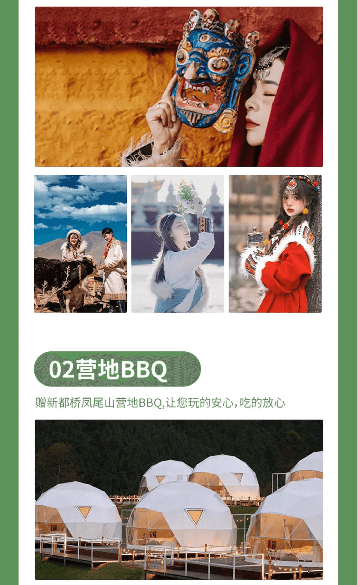 駐地旅拍不指定,由旅行社安排。冬春淡季1-3月新都橋營地BBQ和藏裝旅